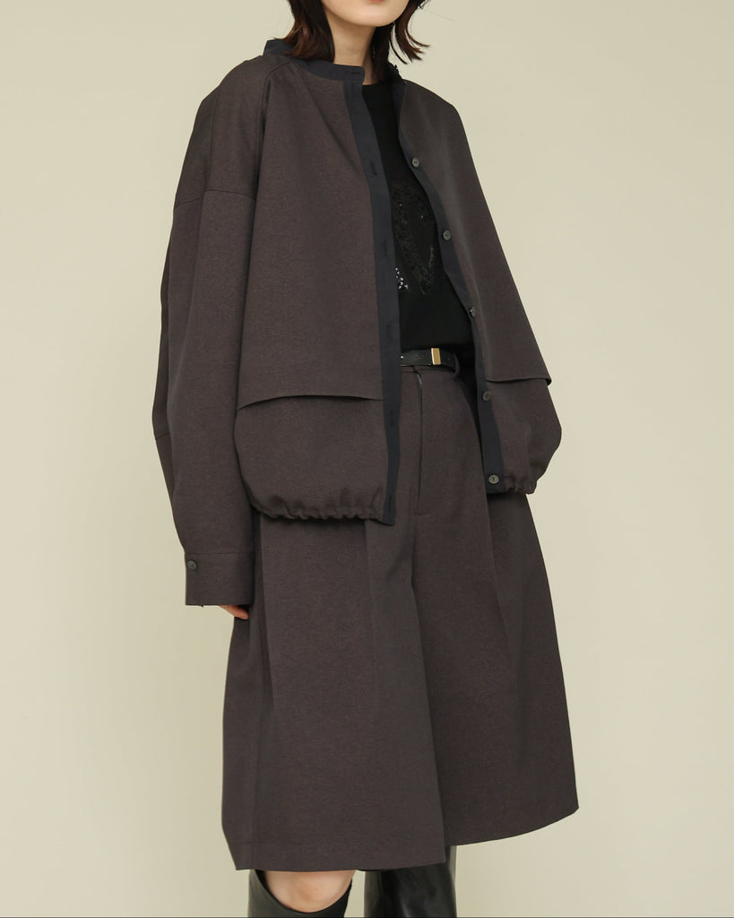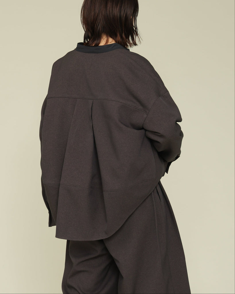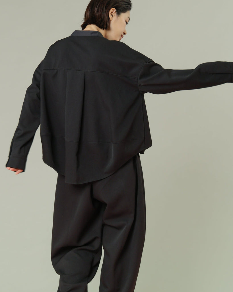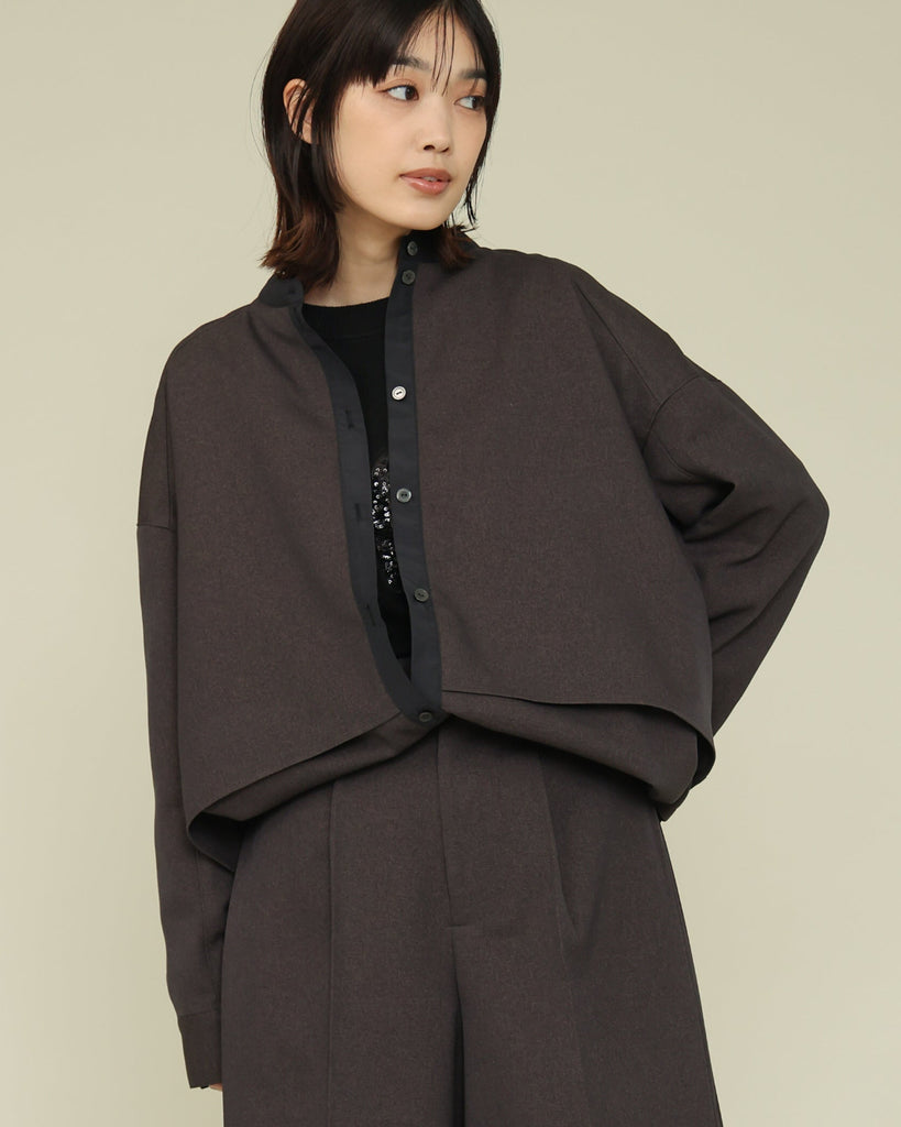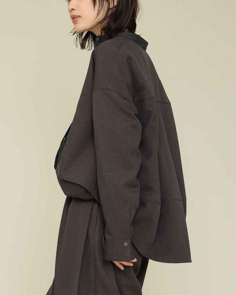 軽く着心地のよいウールライク素材。シワになりにくく気軽に洗えるイージーケアが嬉しいポイント。ふんわりと丸みを持たせたフォルムと、後ろ下がりのデザインがポイントで、前を閉じてブラウス風に、羽織としても使える着回し力の高い一枚です。きれいめにもカジュアルにも馴染み、抜け感のある大人のスタイルに仕上がります。同素材のパンツとセットアップもおすすめです。