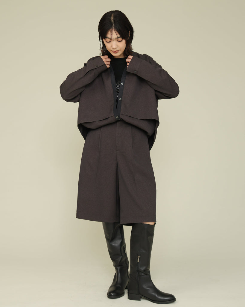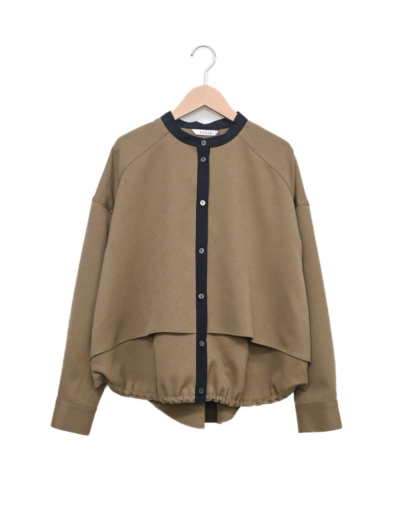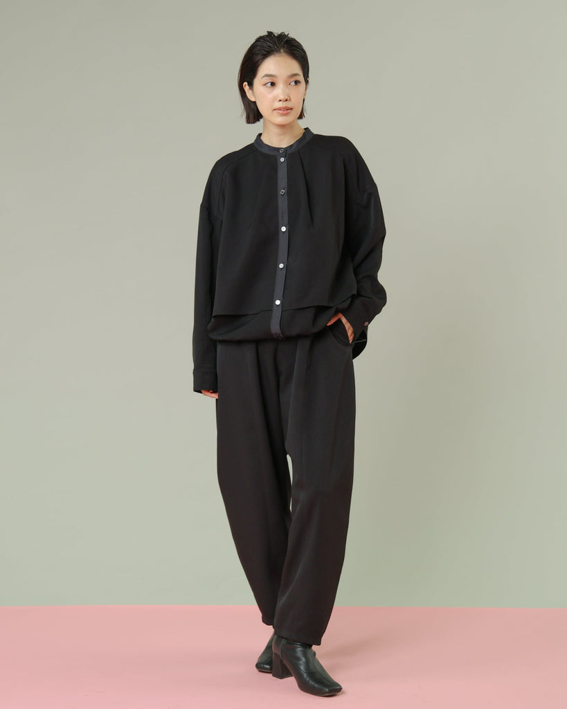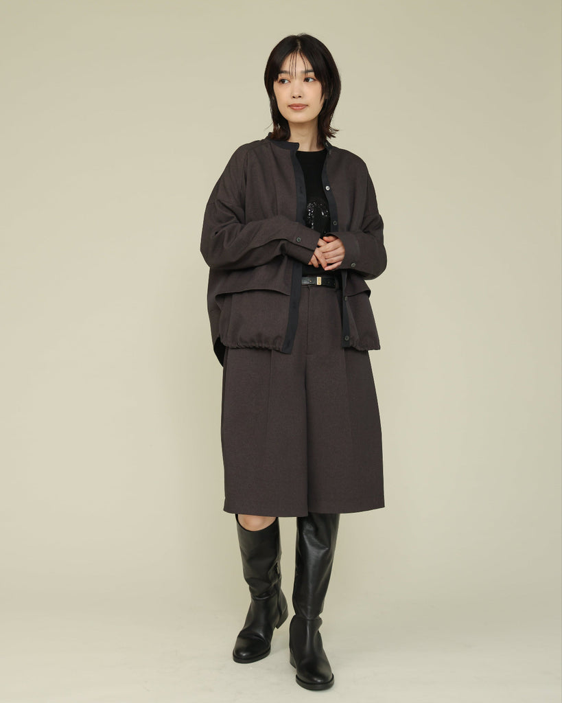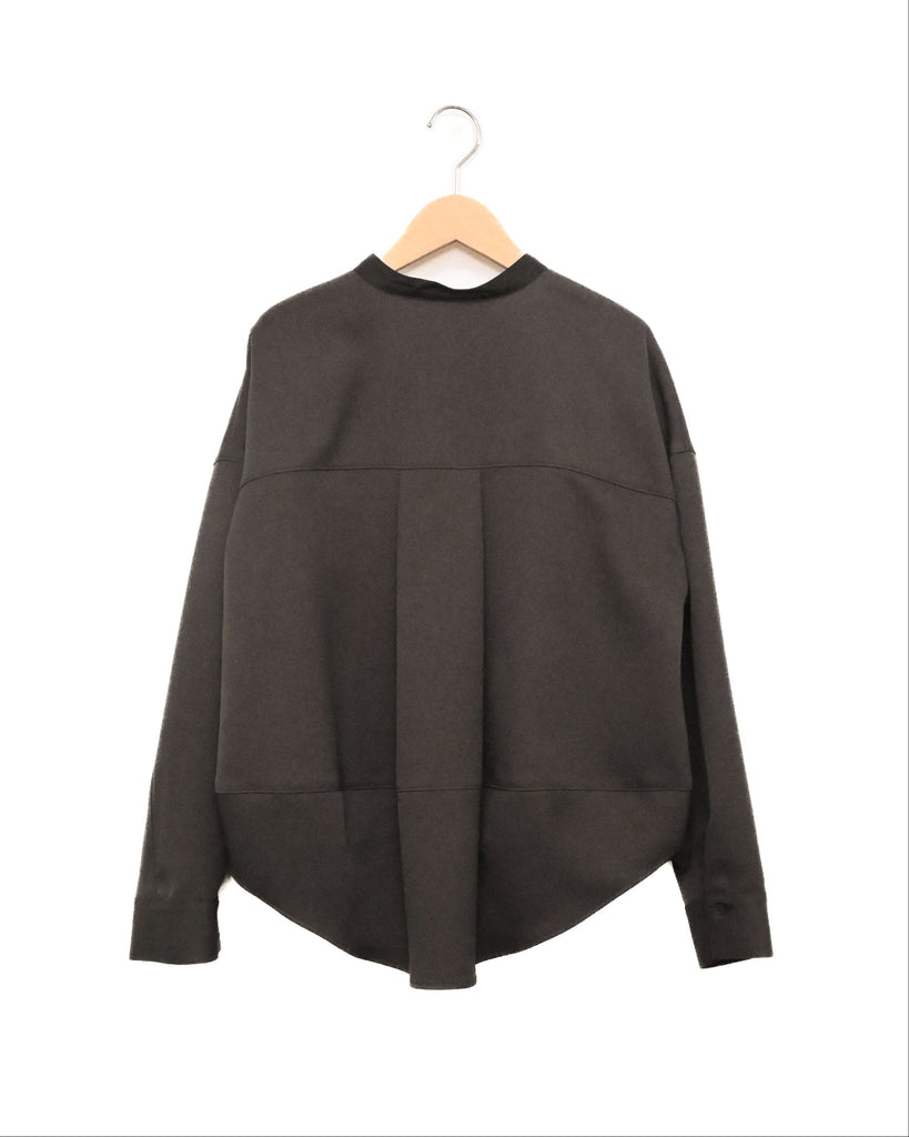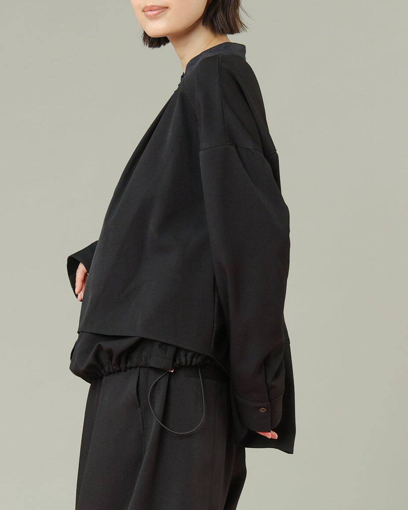 軽く着心地のよいウールライク素材。シワになりにくく気軽に洗えるイージーケアが嬉しいポイント。ふんわりと丸みを持たせたフォルムと、後ろ下がりのデザインがポイントで、前を閉じてブラウス風に、羽織としても使える着回し力の高い一枚です。きれいめにもカジュアルにも馴染み、抜け感のある大人のスタイルに仕上がります。同素材のパンツとセットアップもおすすめです。