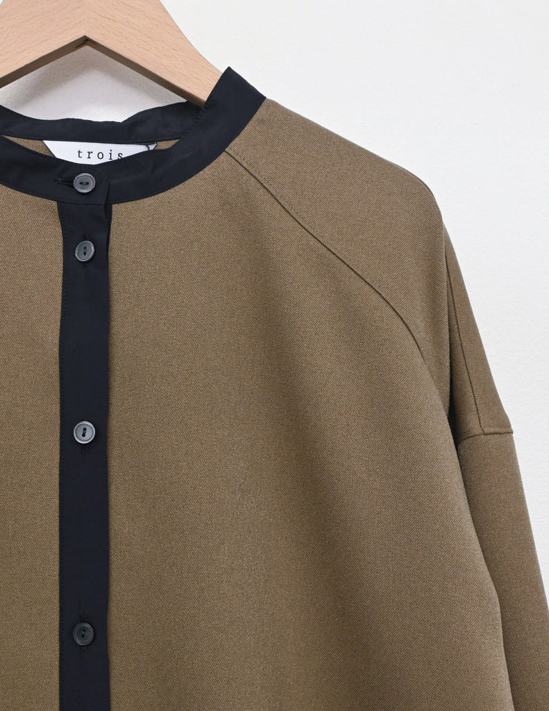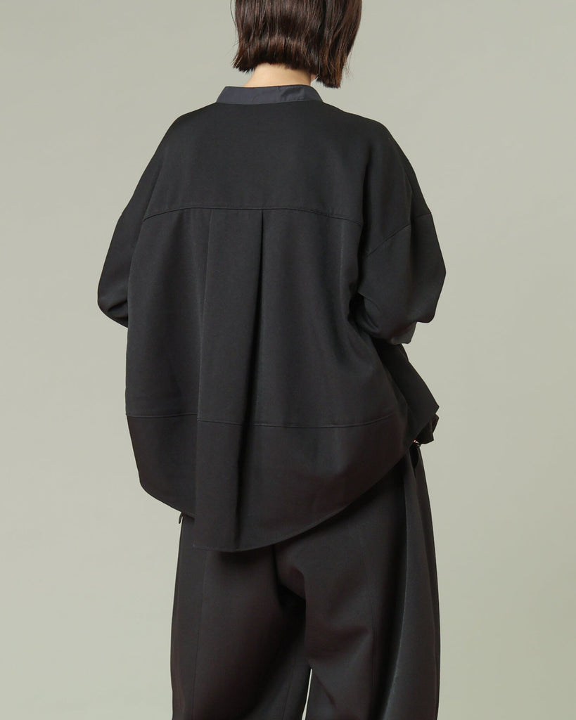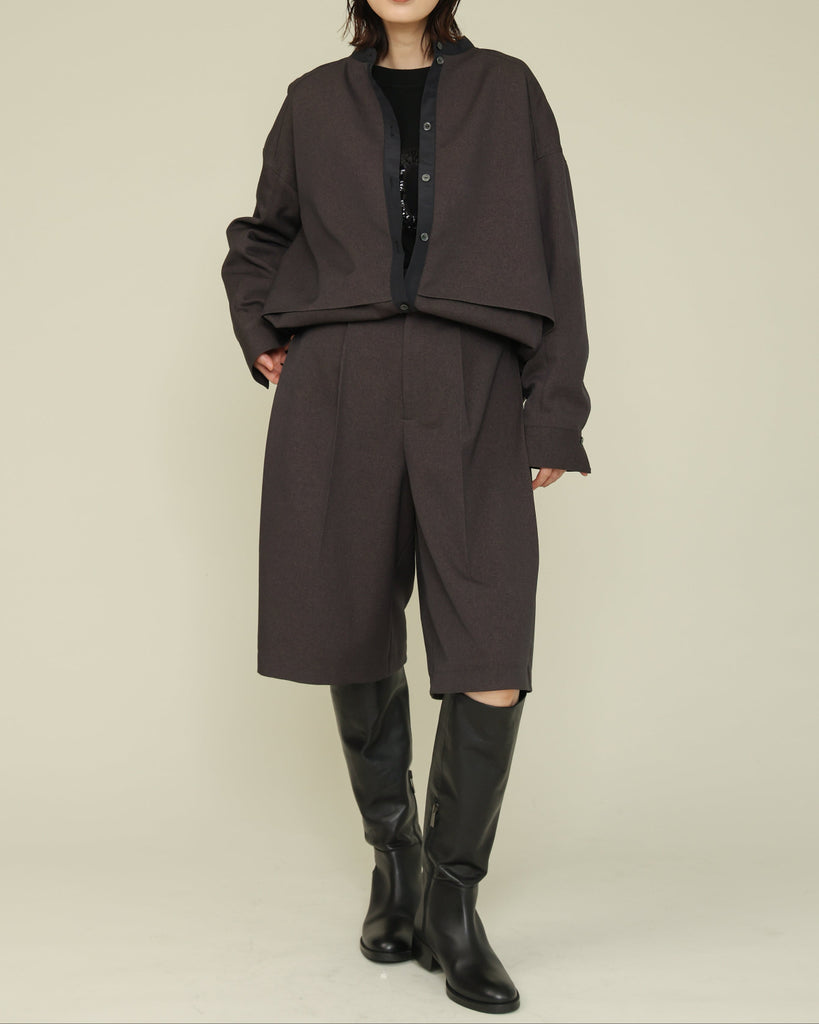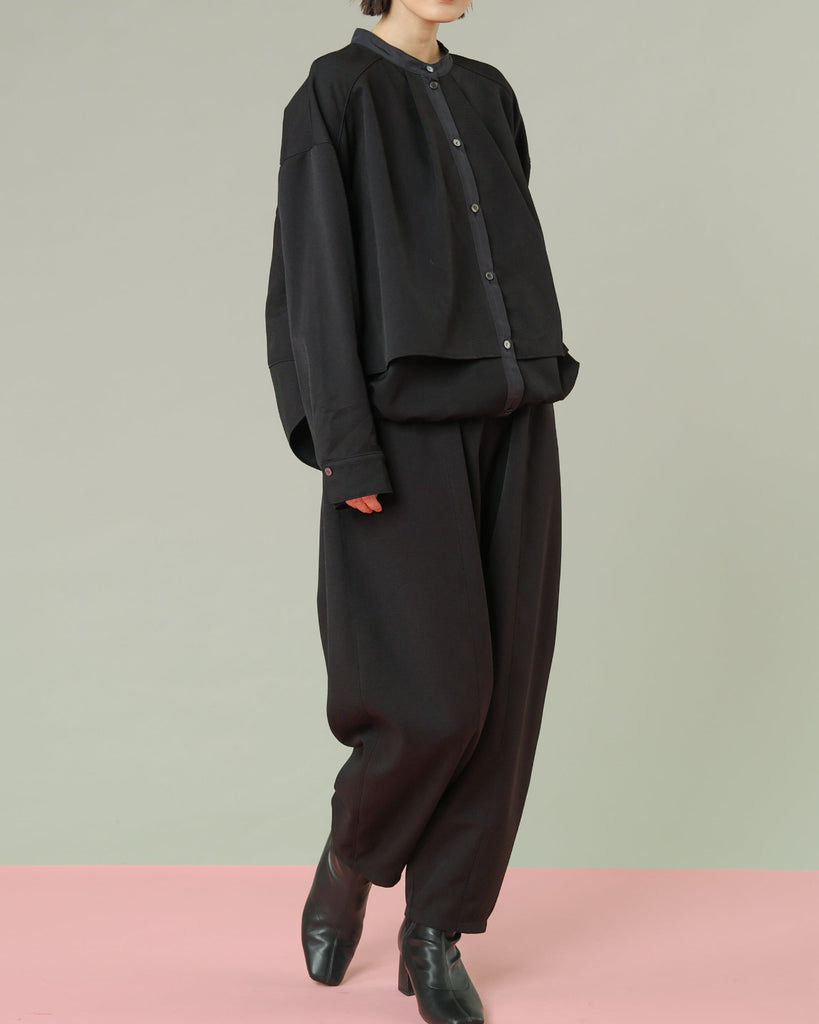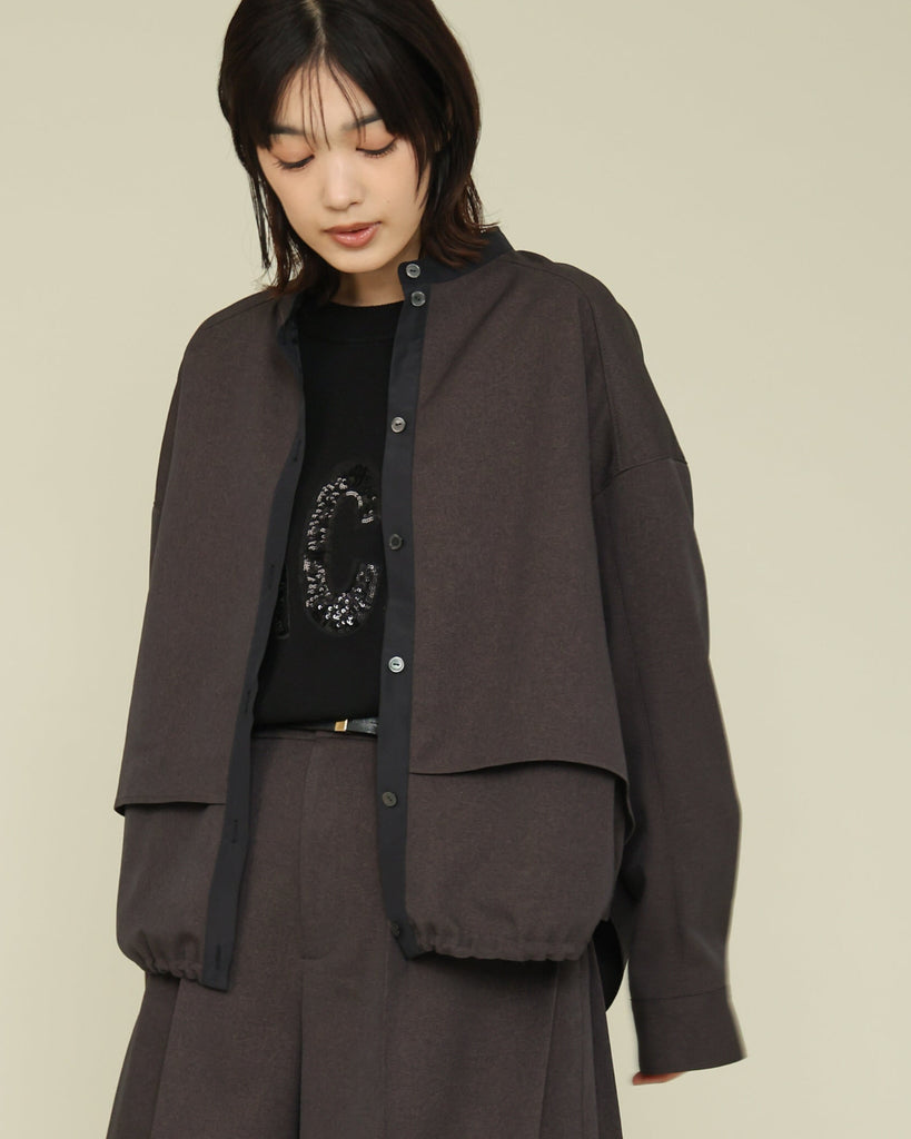 軽く着心地のよいウールライク素材。シワになりにくく気軽に洗えるイージーケアが嬉しいポイント。ふんわりと丸みを持たせたフォルムと、後ろ下がりのデザインがポイントで、前を閉じてブラウス風に、羽織としても使える着回し力の高い一枚です。きれいめにもカジュアルにも馴染み、抜け感のある大人のスタイルに仕上がります。同素材のパンツとセットアップもおすすめです。