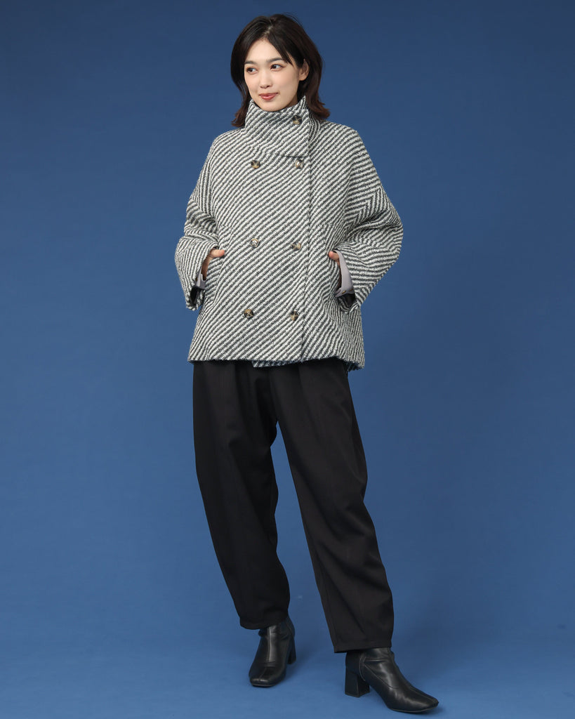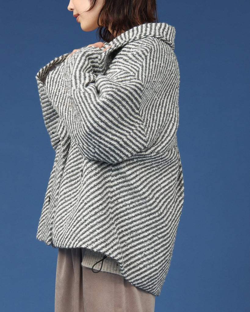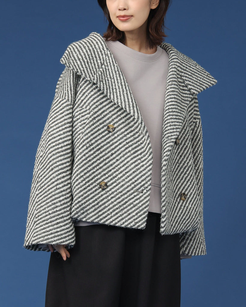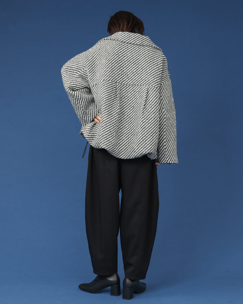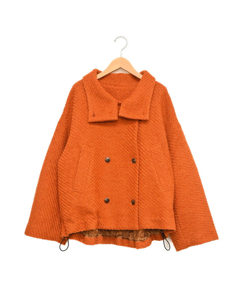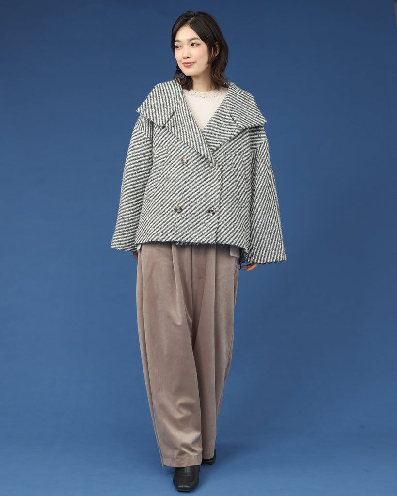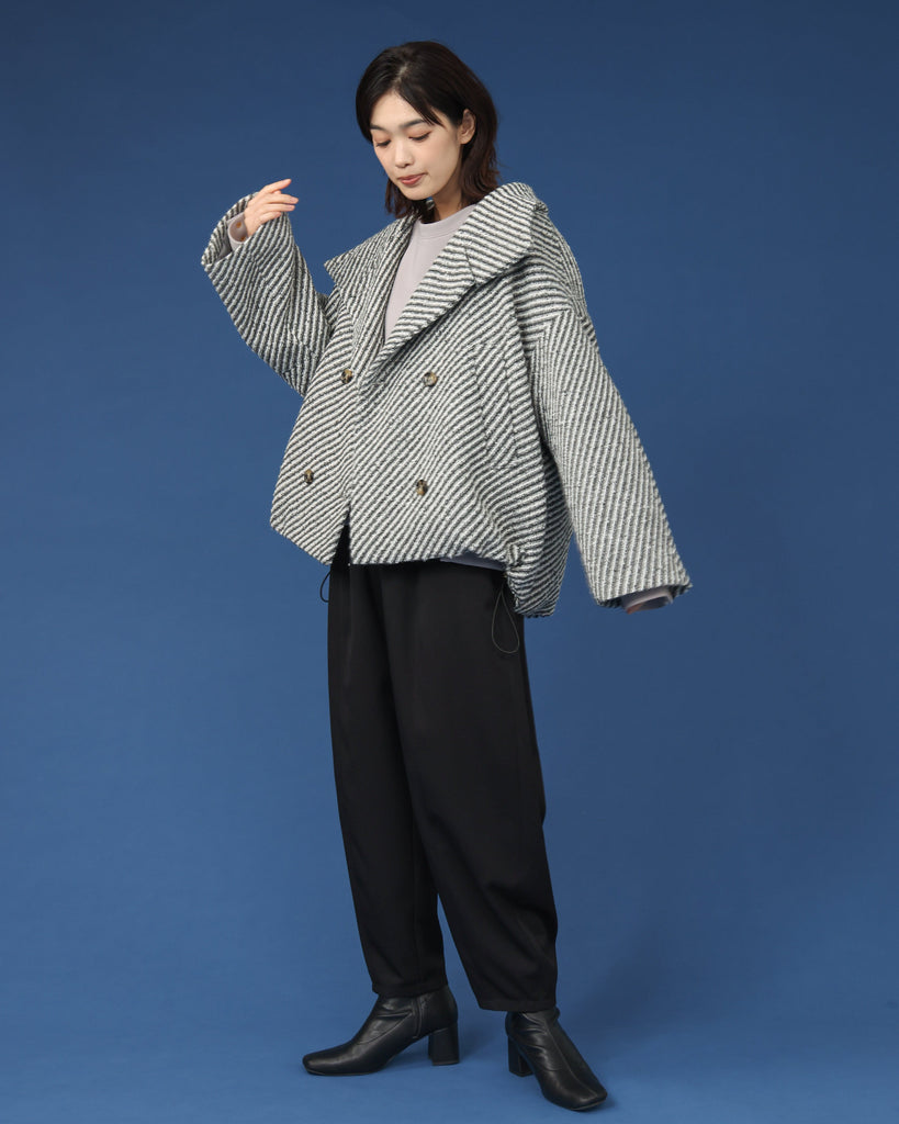 襟の着こなし次第で、違った表情に見せてくれます。表面に立体感と高級感があり、着るだけで上品な雰囲気に。短めの丈でバランスが取りやすく、ワイドパンツやスカートとも相性抜群です。