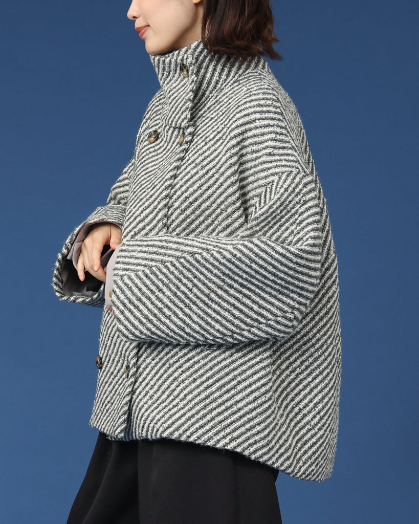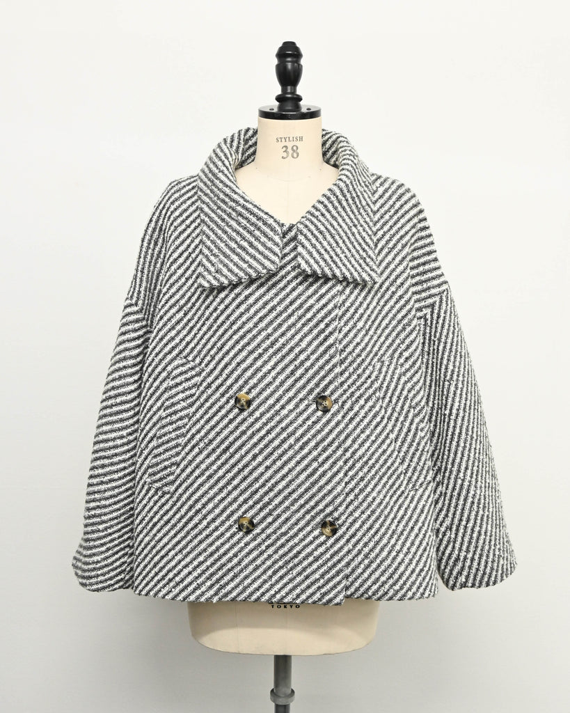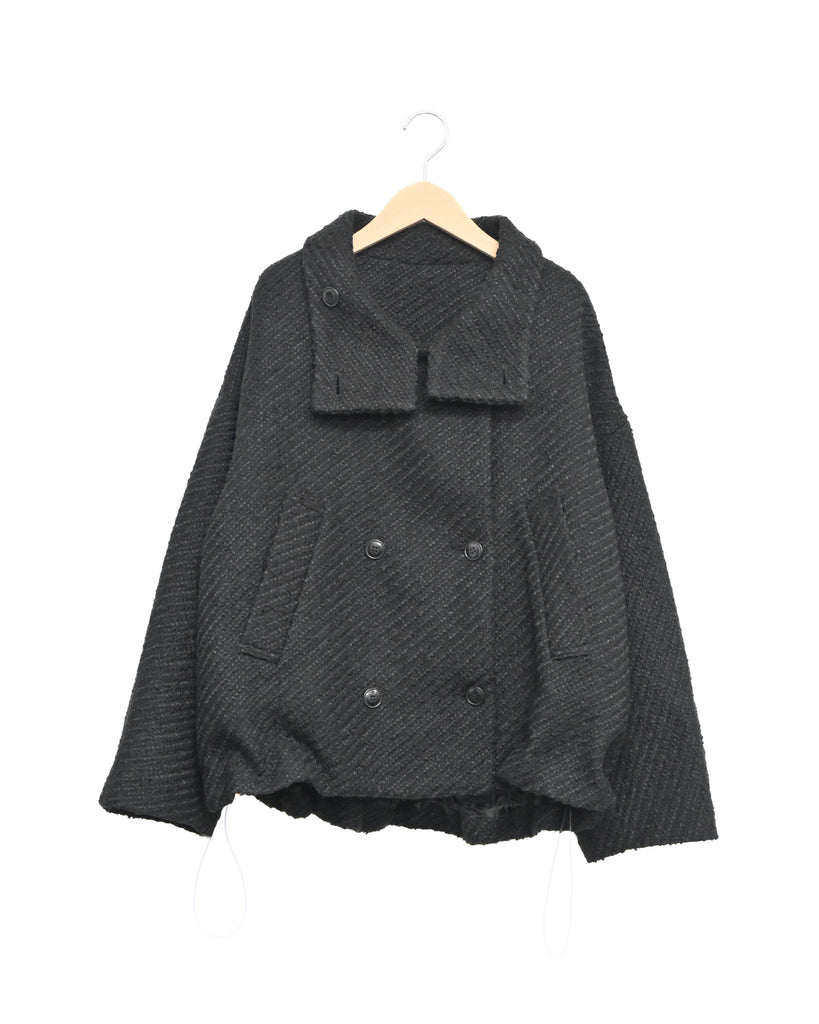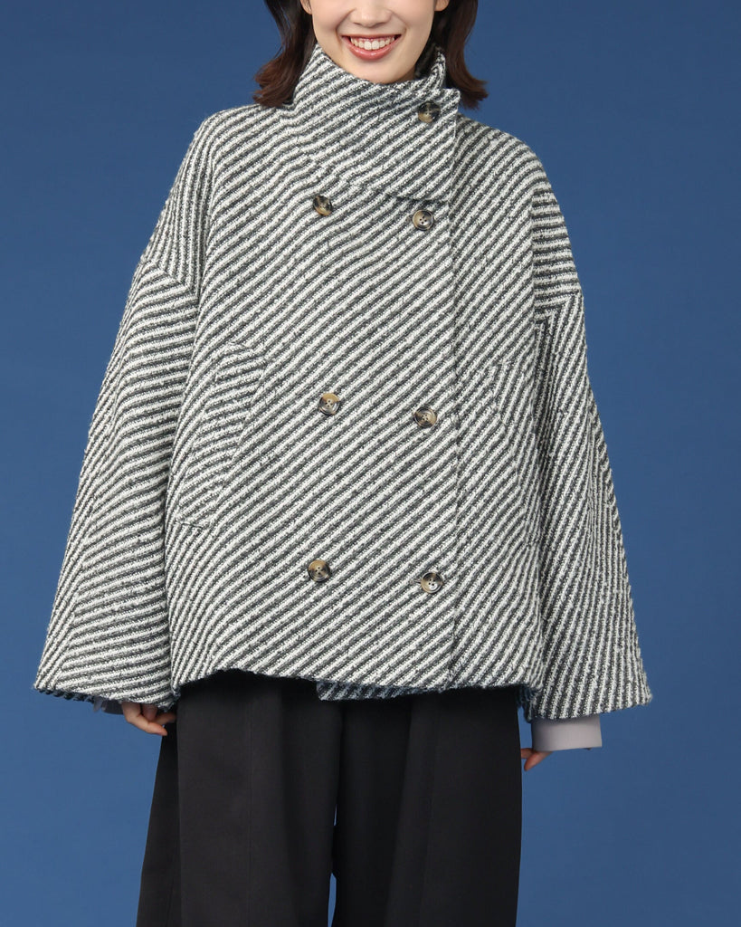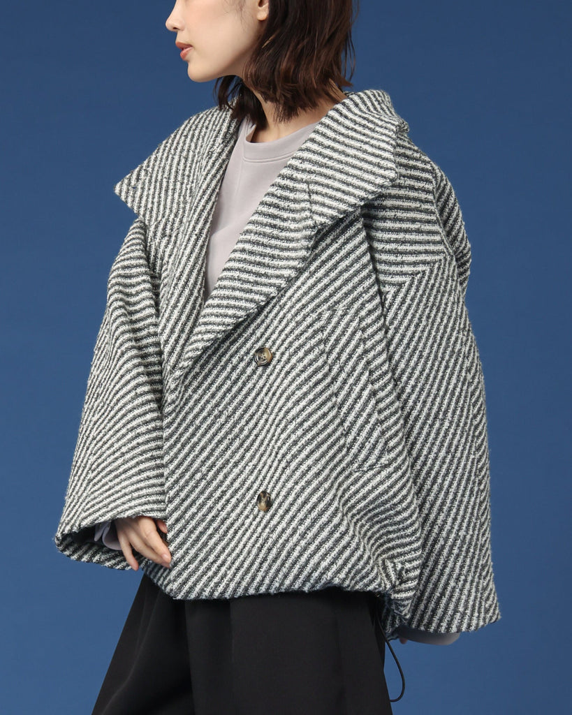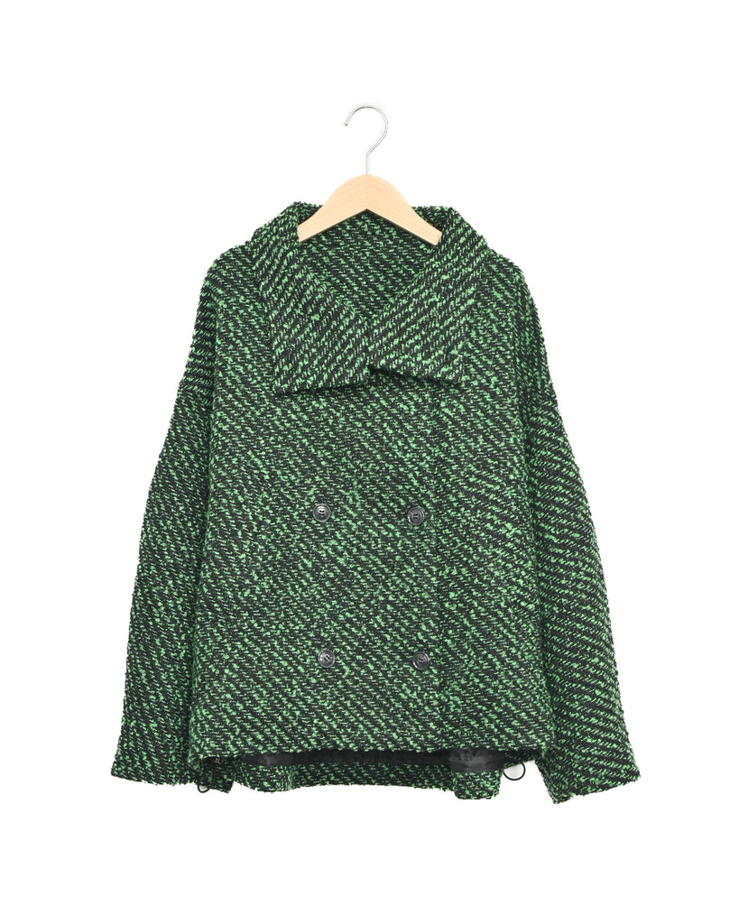 襟の着こなし次第で、違った表情に見せてくれます。表面に立体感と高級感があり、着るだけで上品な雰囲気に。短めの丈でバランスが取りやすく、ワイドパンツやスカートとも相性抜群です。