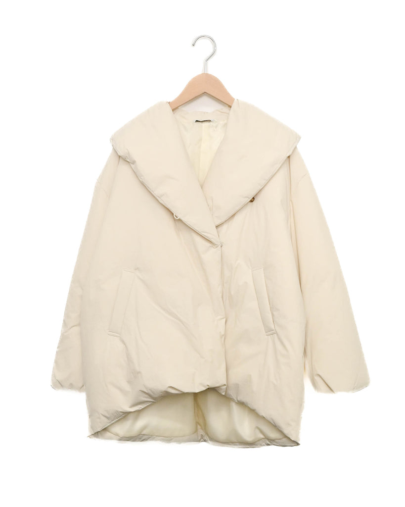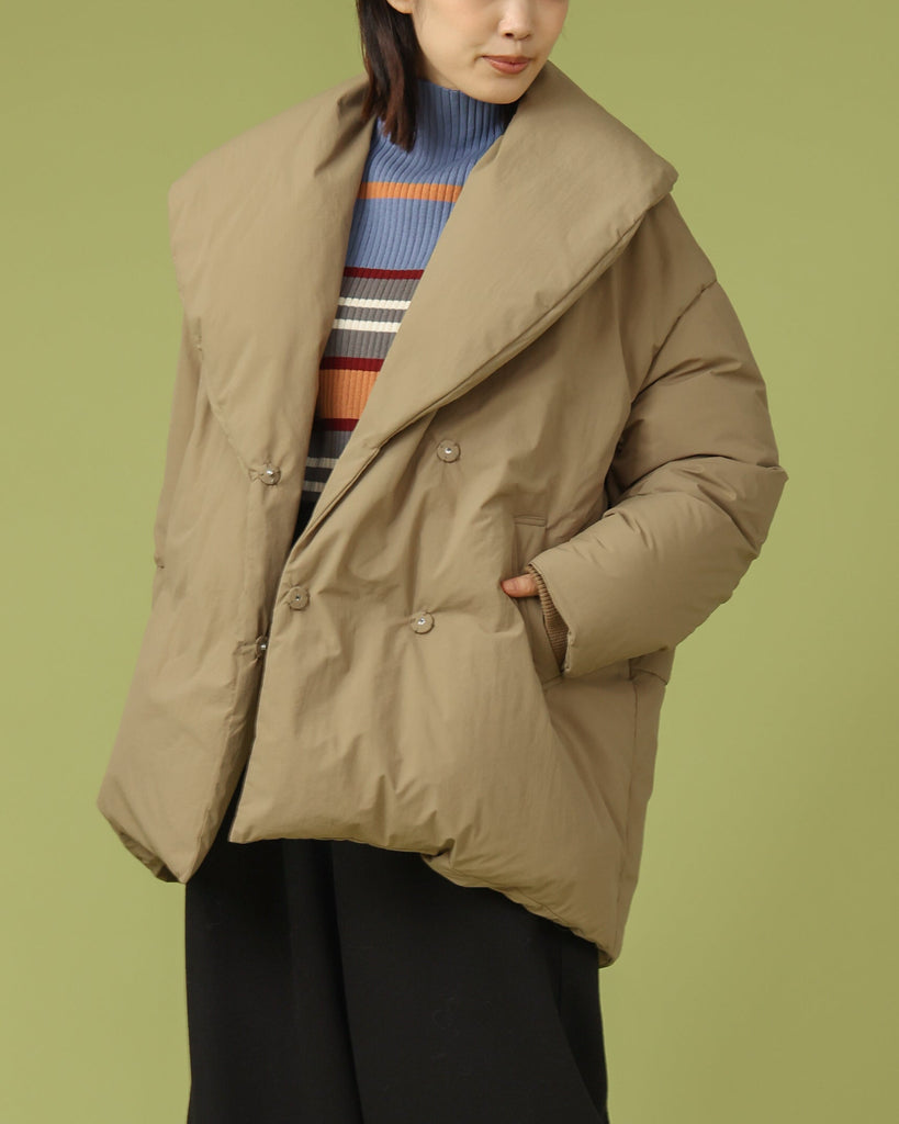 顔まわりを包み込むようなショールカラーがデザインのポイントで、立体感のある襟がウォーム感をプラス。膨らみのある生地感ながら、切替で絶妙にすっきりと着こなせる一枚です。柔らかくしなやかな素材を使用しており、カジュアルになりすぎず大人の雰囲気を演出します。寒い季節も暖かく、デイリーに活躍するアウターです。
