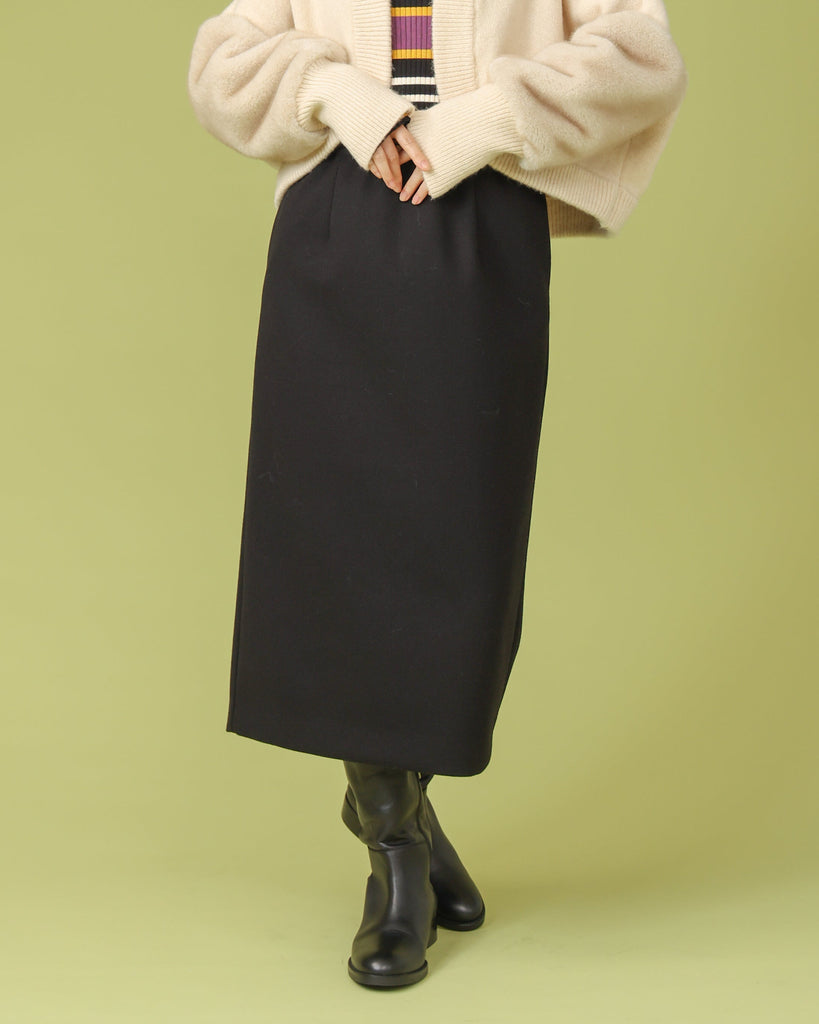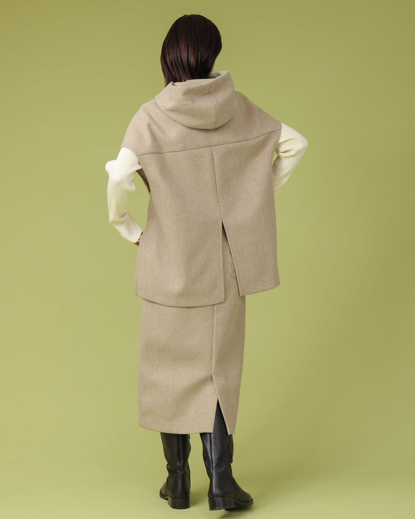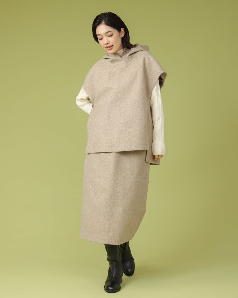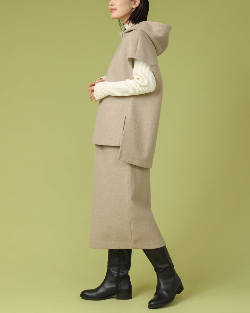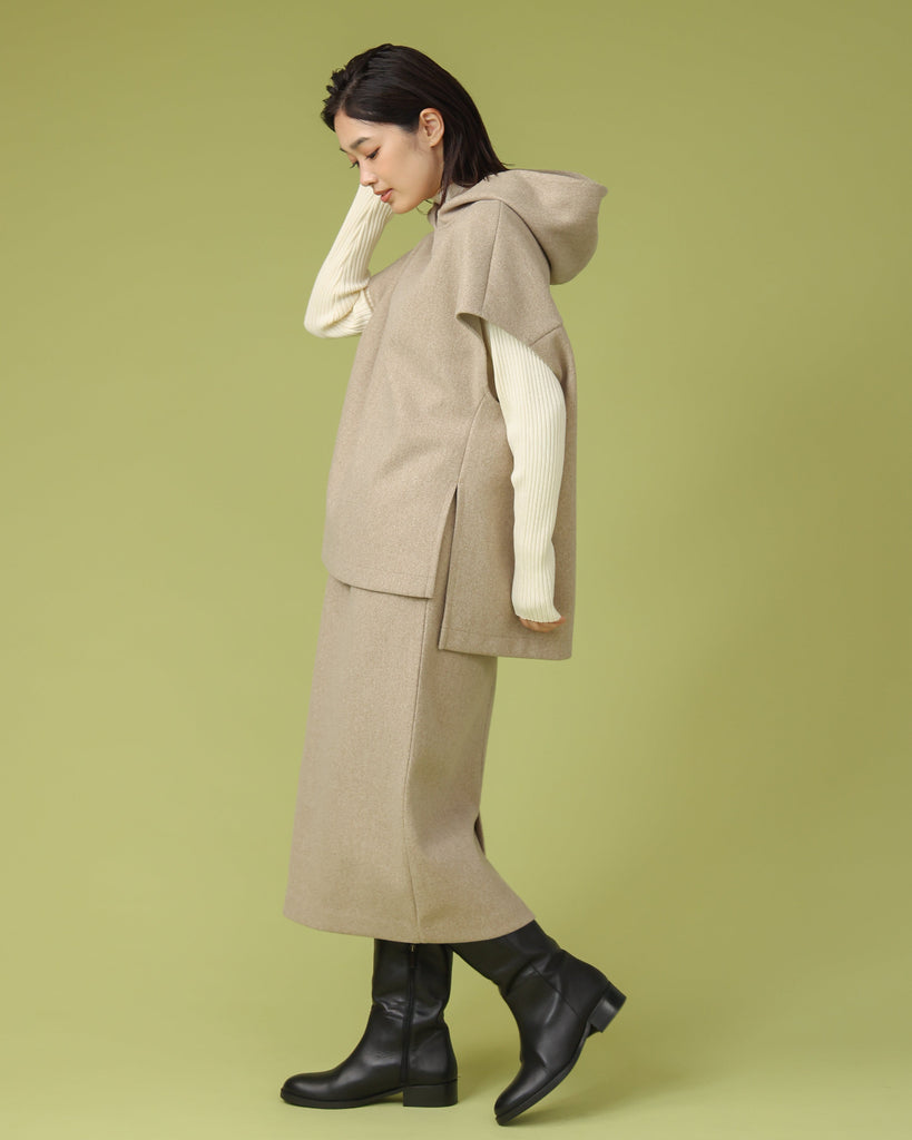 厚手で表面に起毛を施したジャージー素材。同縦長シルエットのIラインがすっきりとした印象に。バックスリットで足さばきも良く上品に履いていただけます。ブーツと合わせてすらっと脚長効果も◎シリーズのフードベストとのセットアップもおすすめです。