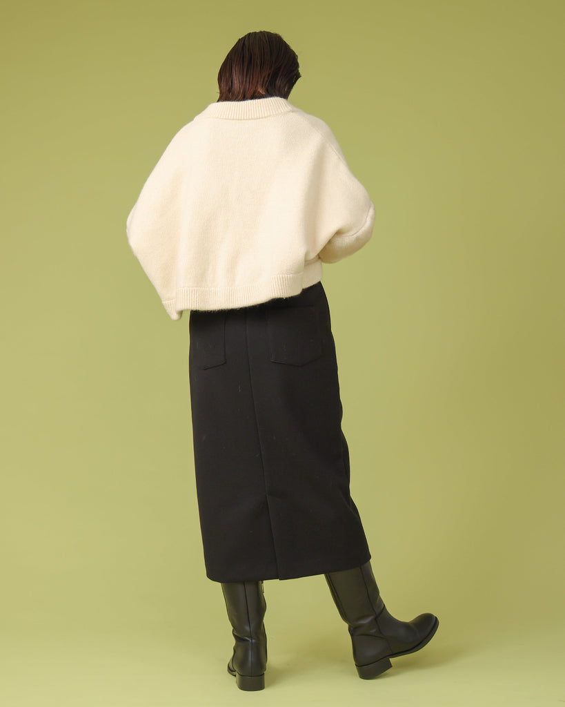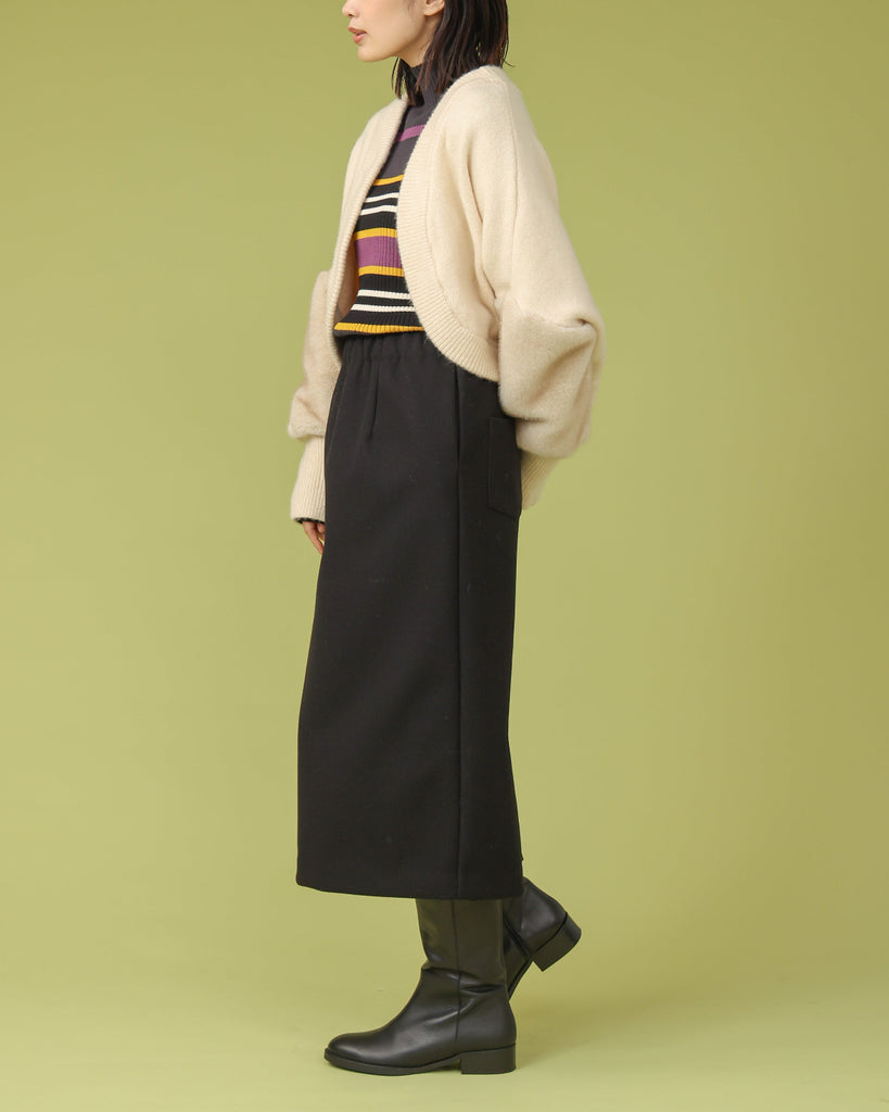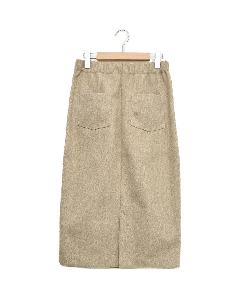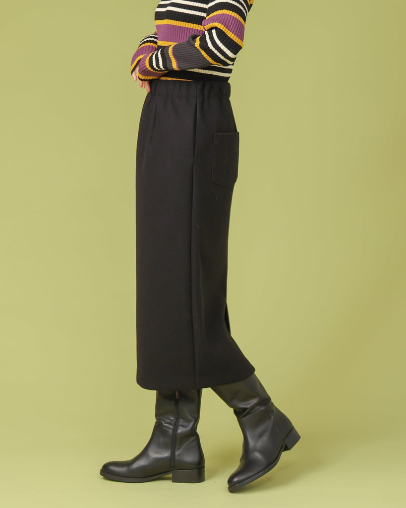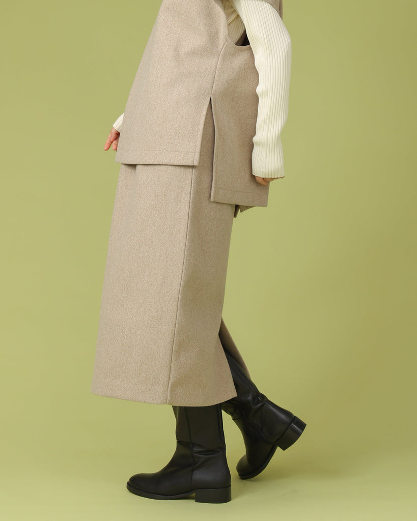 厚手で表面に起毛を施したジャージー素材。同縦長シルエットのIラインがすっきりとした印象に。バックスリットで足さばきも良く上品に履いていただけます。ブーツと合わせてすらっと脚長効果も◎シリーズのフードベストとのセットアップもおすすめです。