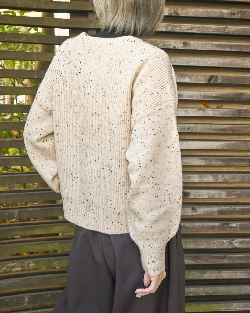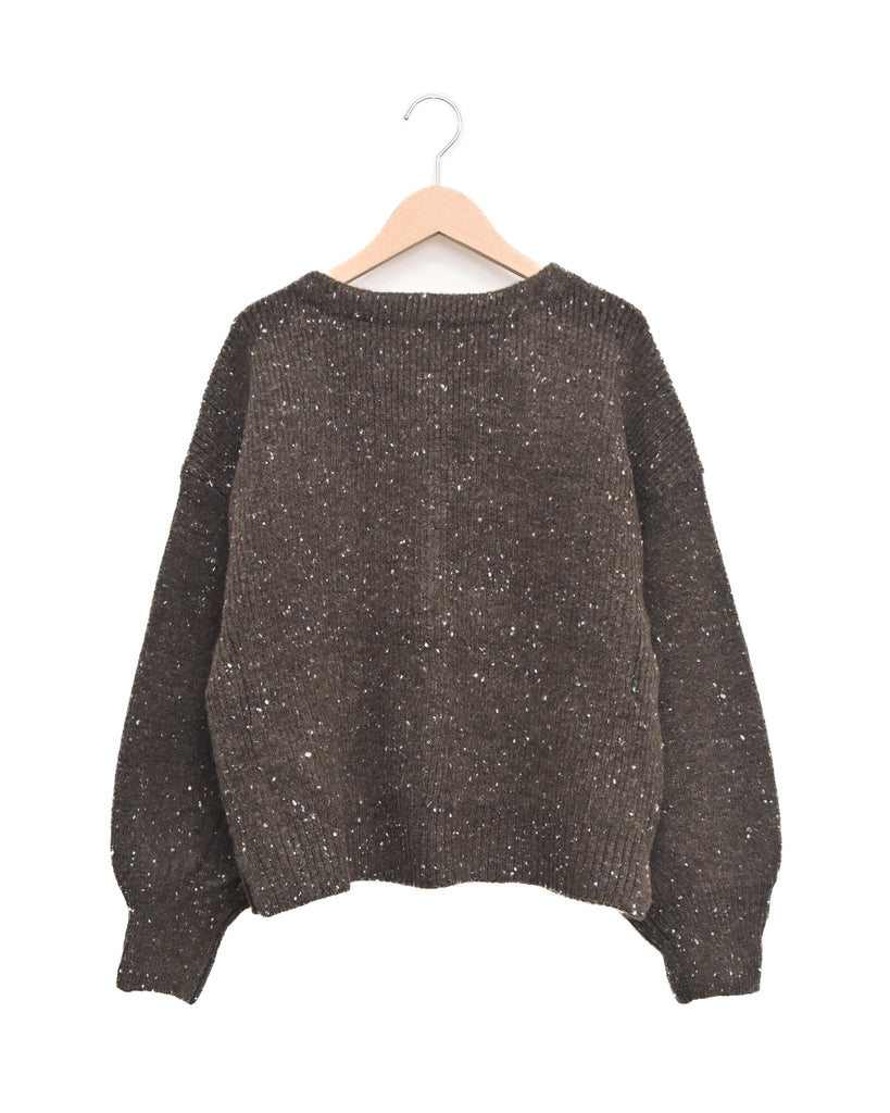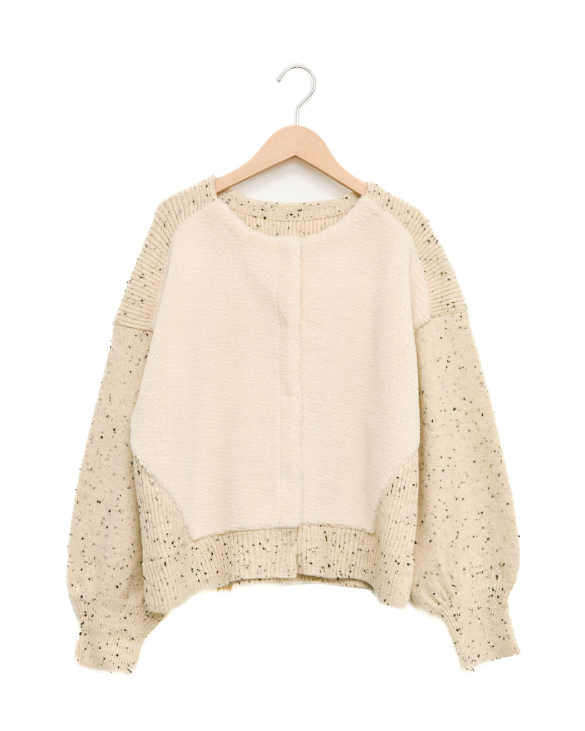 風合いのあるMIX糸のニットに、ボア素材の切り替えを施したカーディガン。