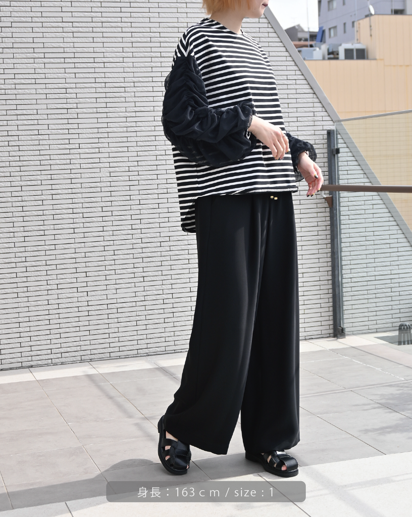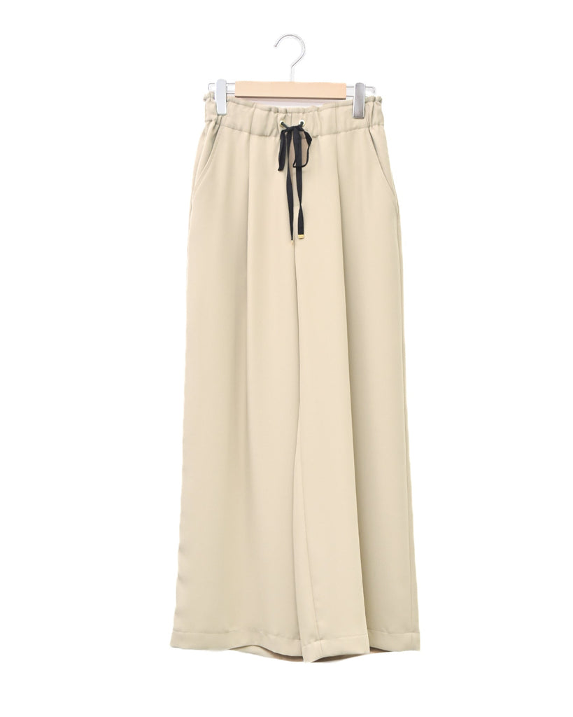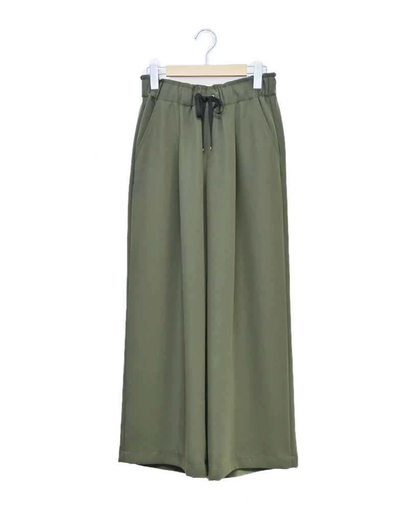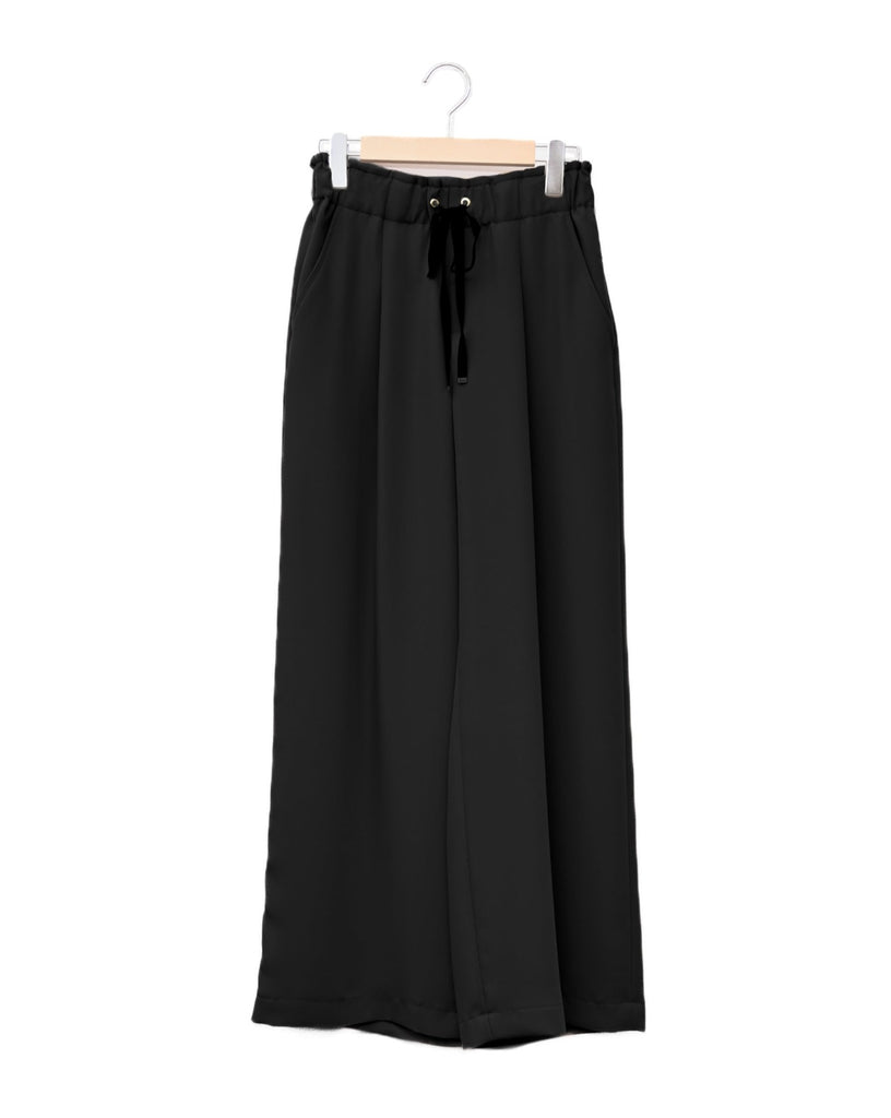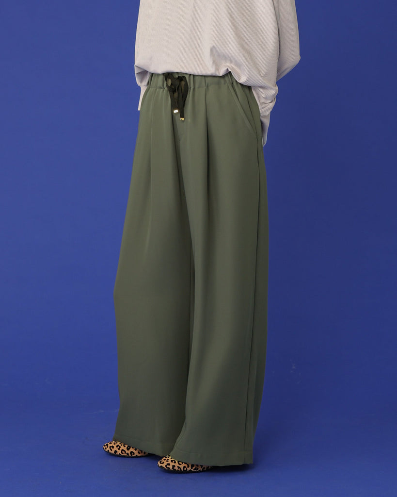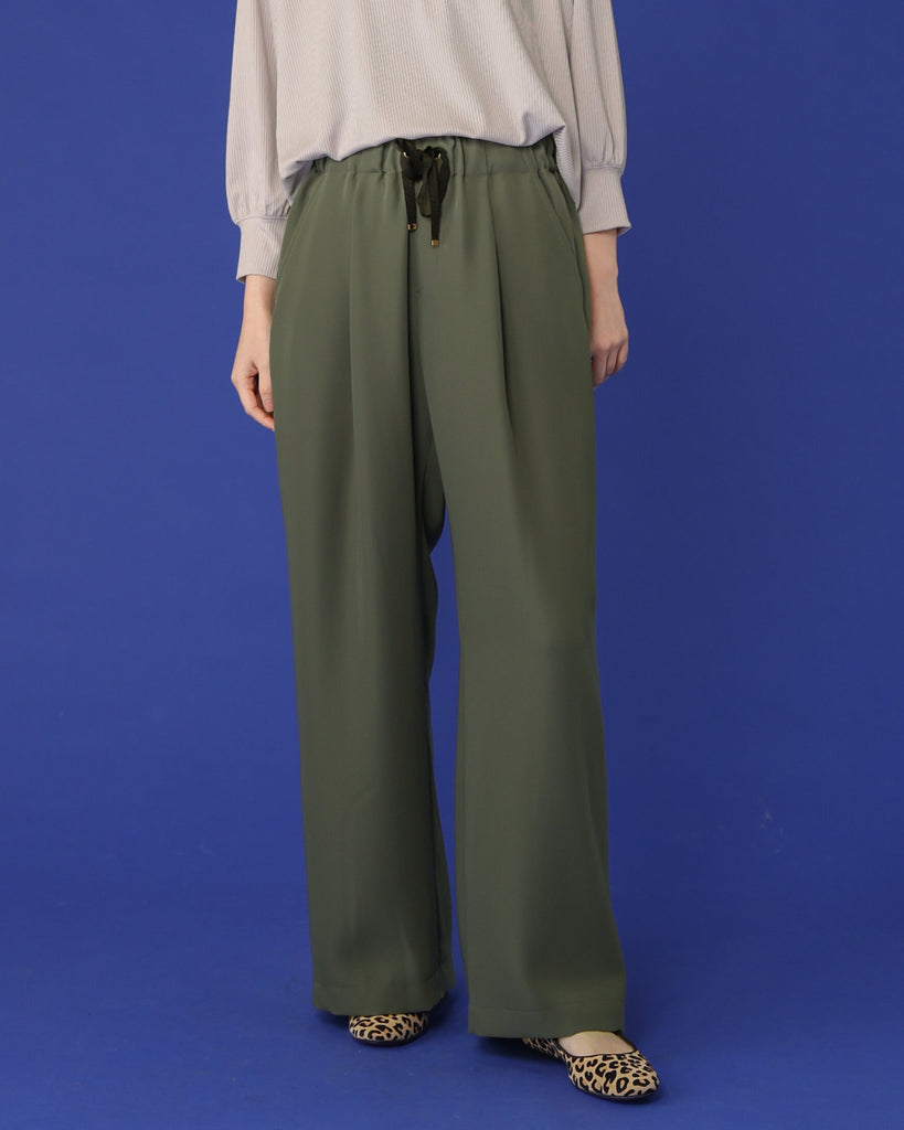 シワになりにくくお手入れも簡単です。ウエストを自由に絞れるデザインが、タックインにした際、すっきりとした着こなしに。リラックスな履き心地ながら、上品なドレープと光沢感が大人なシルエットを演出します。