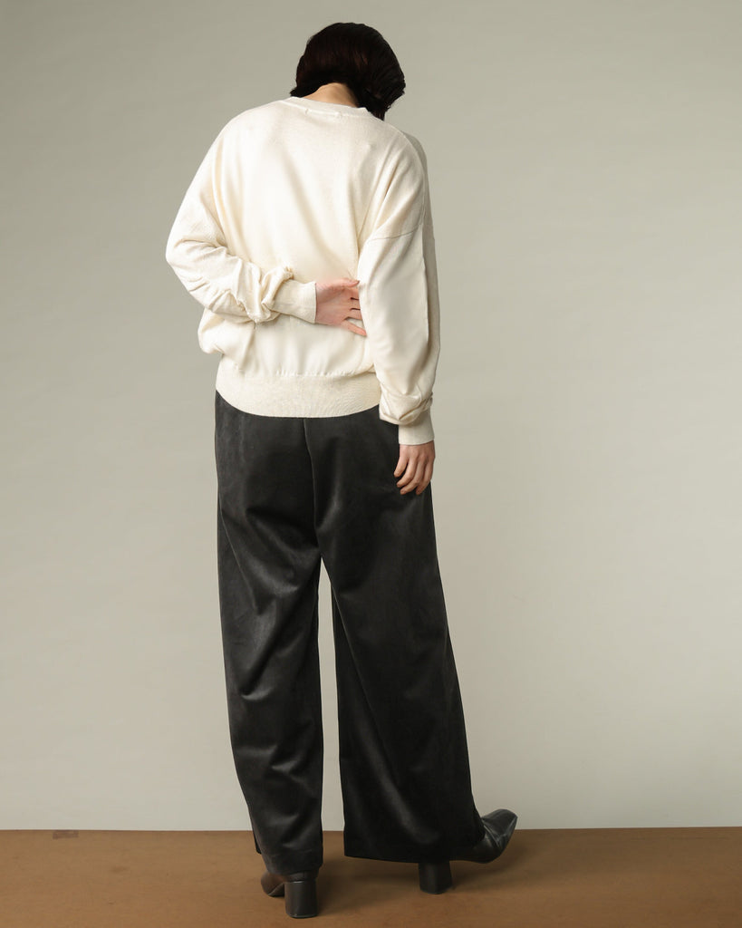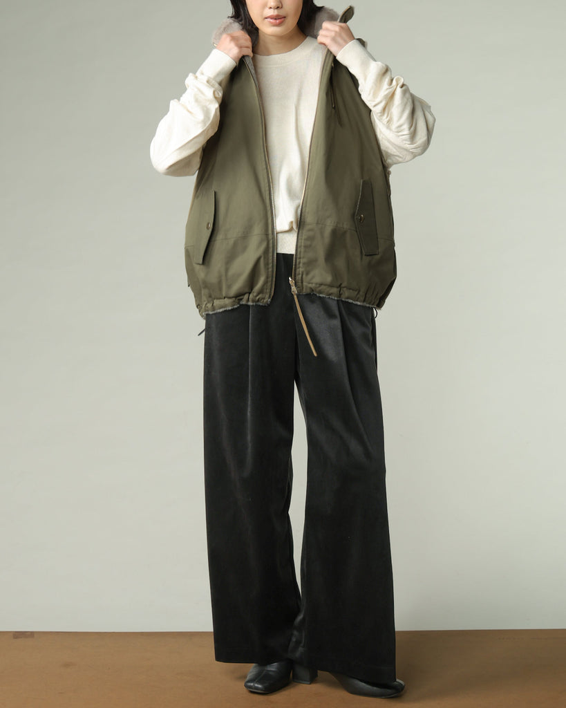 マイクロポリエステルを使用したトリコットベロア吸水性・速乾性に優れています。柔らかく肌触りの良さが特徴。軽く滑らかな素材で、ストレスのないリラックスした穿き心地を実現。深めに入れたタックが立体感を生み、動くたびに美しいドレープを描きます。セミワイドシルエットで脚のラインを拾わず、体型カバー効果も抜群。