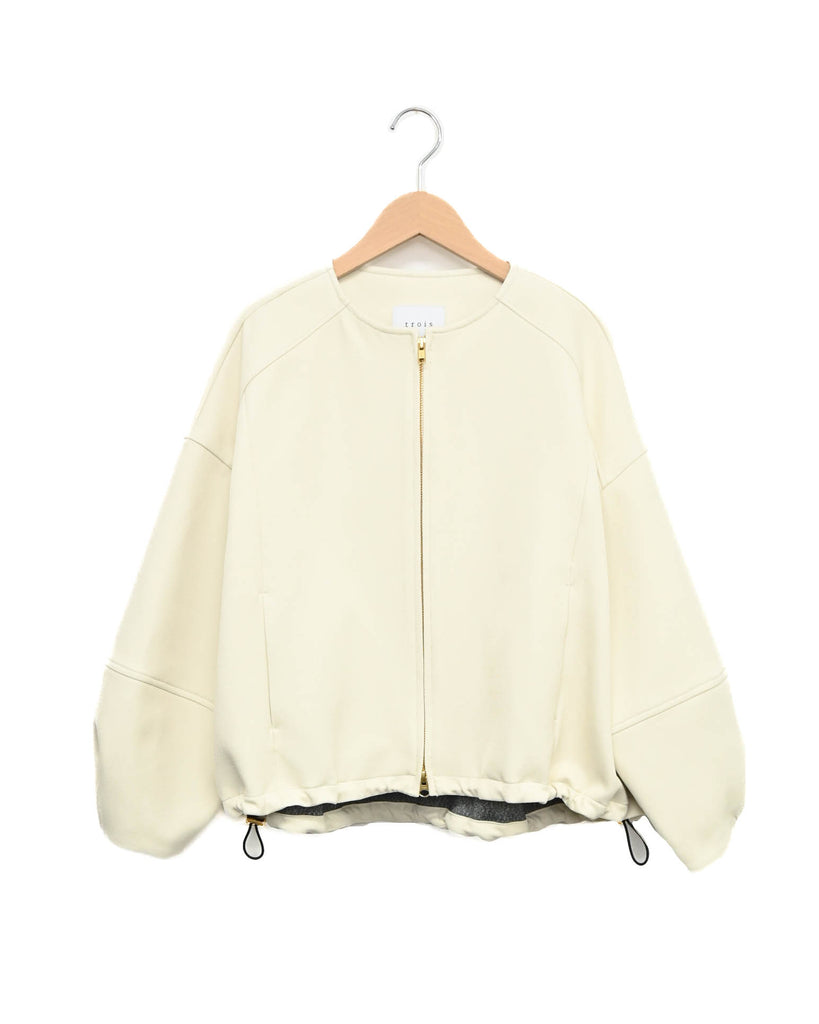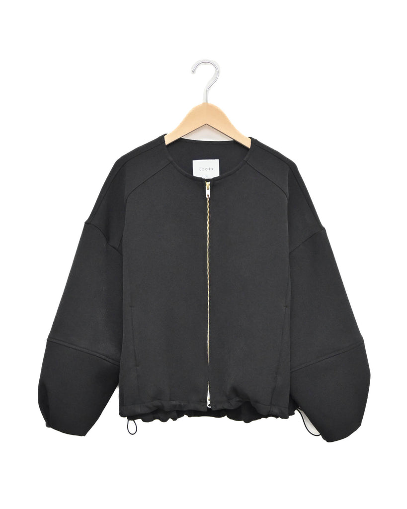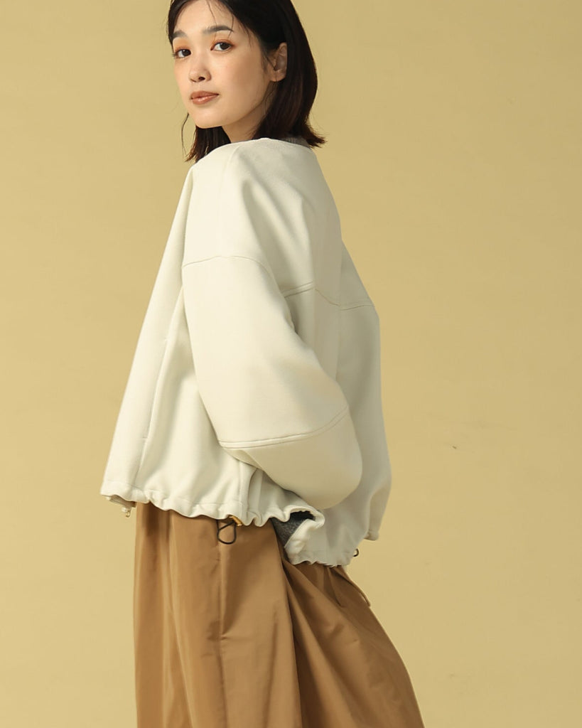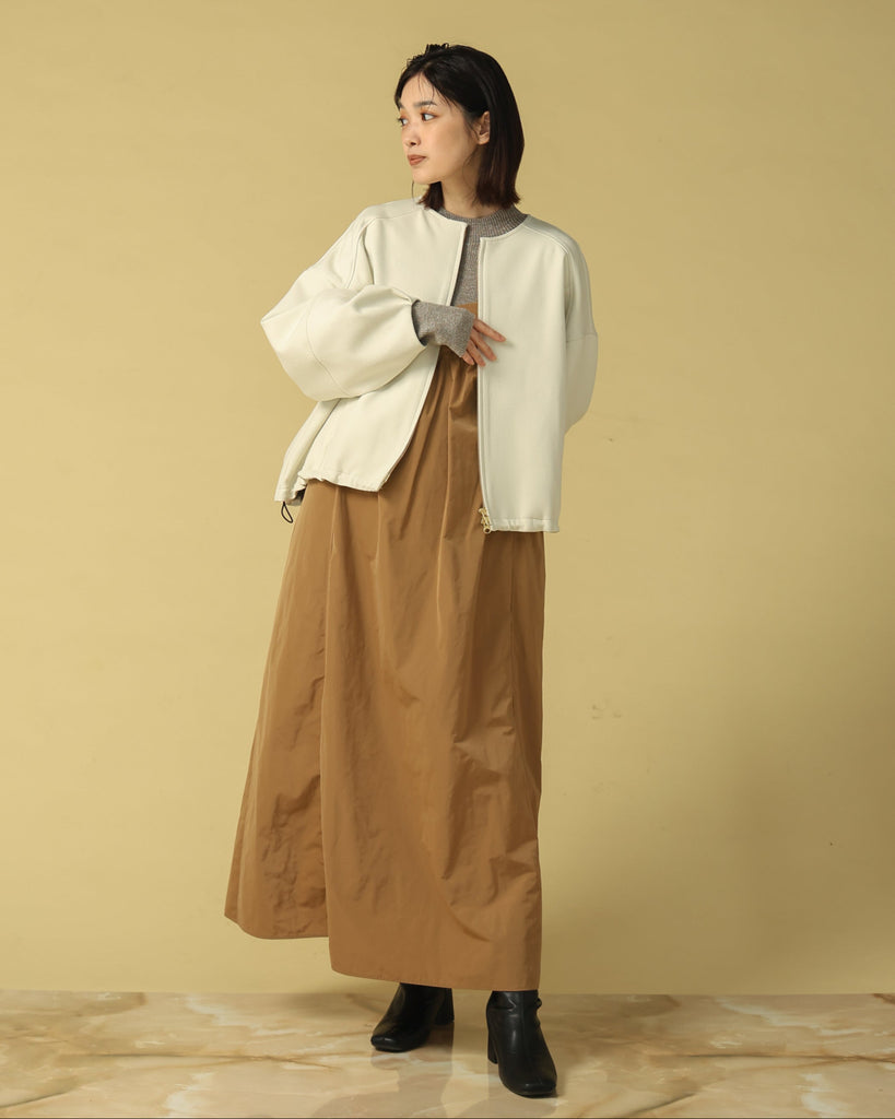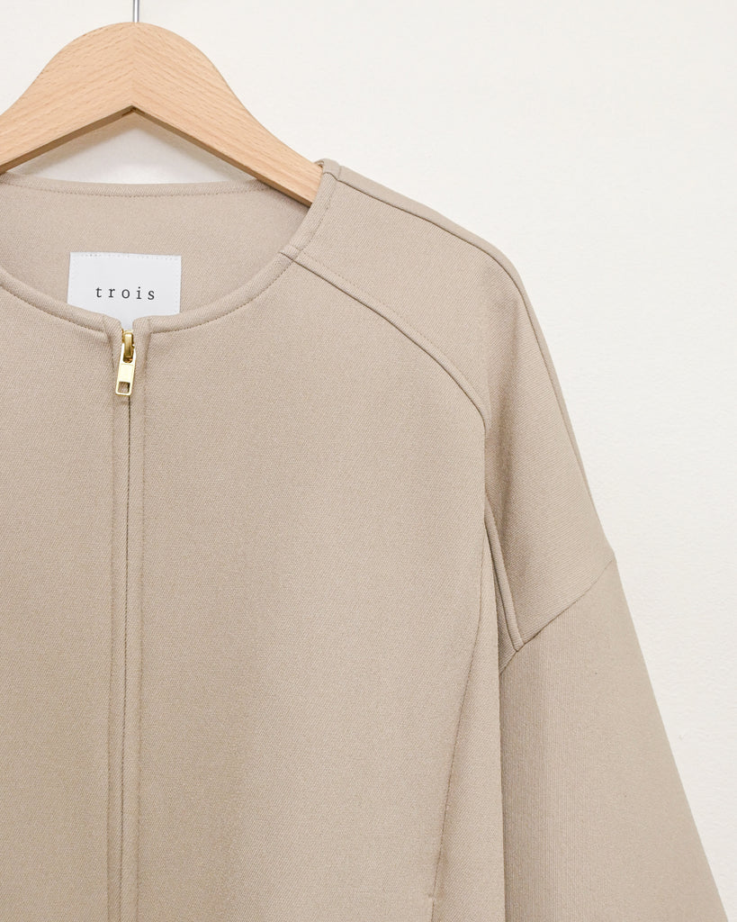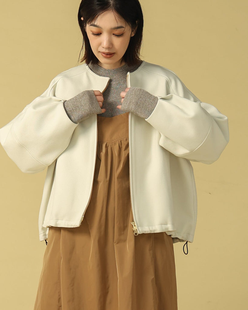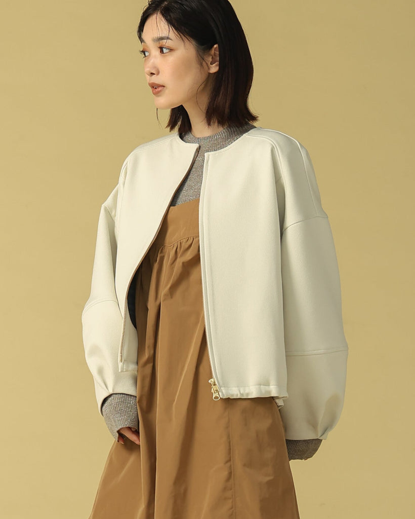 ラウンドネックのノーカラーデザインとフロントジップで顔まわりがすっきり見え◎適度にゆとりのあるボックスシルエットは、ニットやスウェットの上からでも重ねやすい万能アウターです。