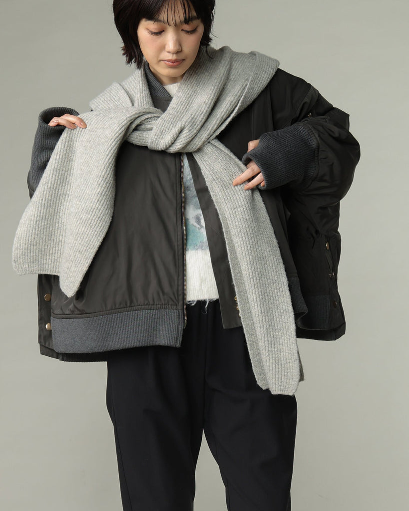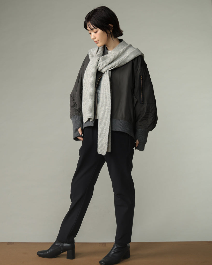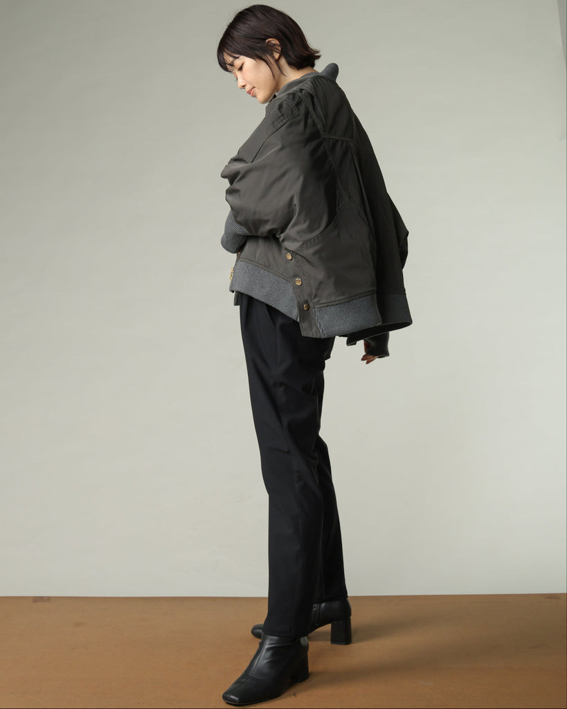肩のラインを落としたドロップショルダーと、たっぷりとした袖のボリュームがこなれ感を演出。羽織るだけで抜け感のあるスタイリングが完成します。裾のドローストリングでシルエットの調整もでき、スカートにもパンツにも合わせやすい丈感。カジュアルコーデに活躍する、今季の主役アウターです。