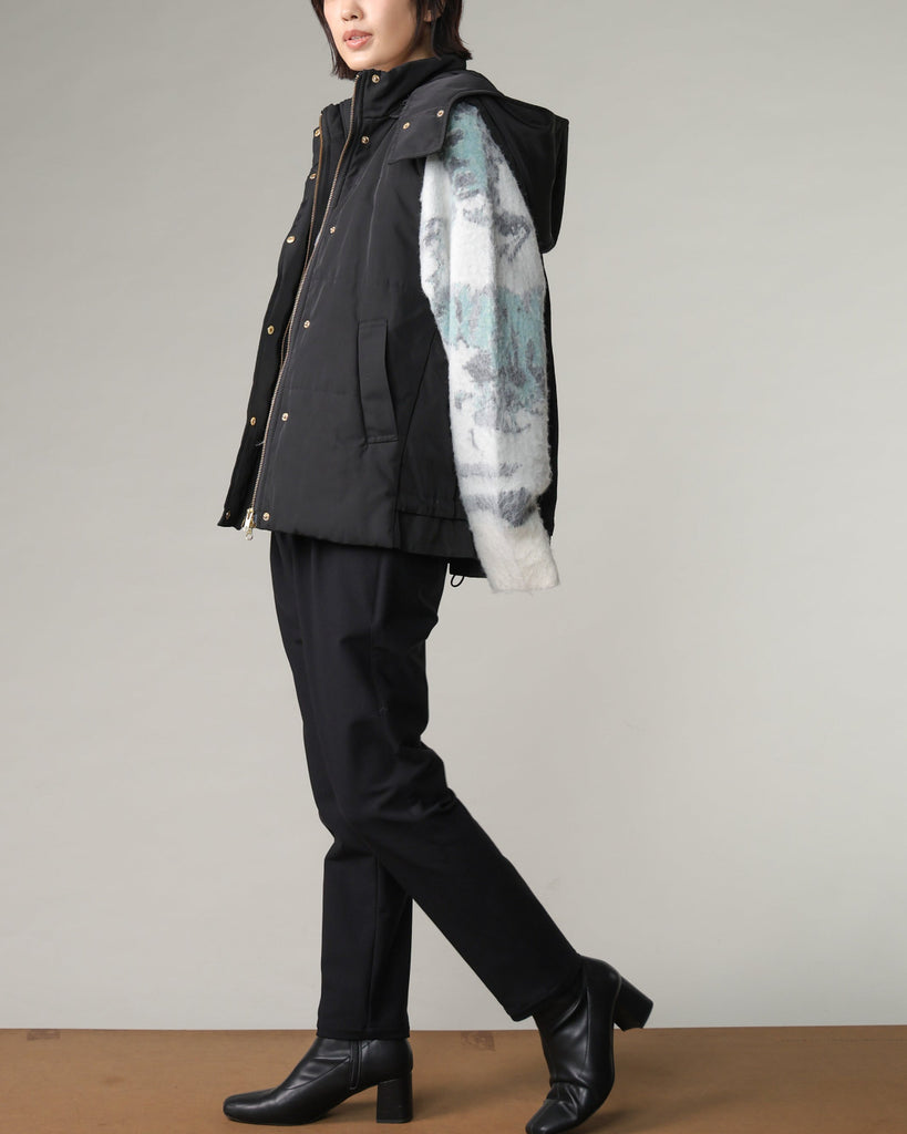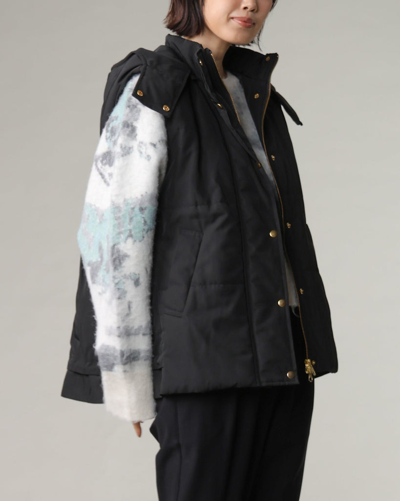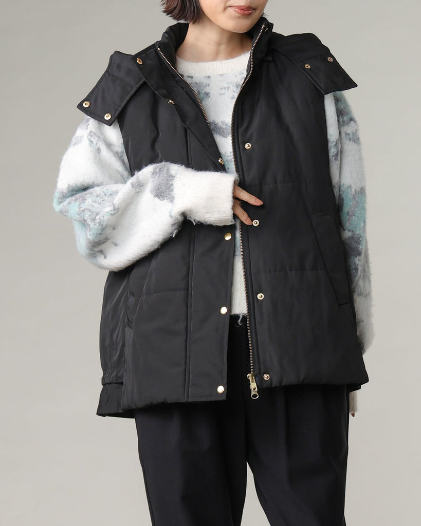ふっくらとしたフォルムが特徴の軽さにこだわった中綿フードベスト。