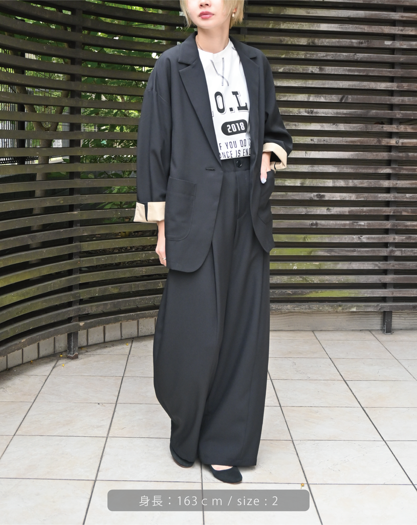 腰回りは程よくフィットしつつ、裾にかけてゆったり広がるラインが脚のラインを拾わず、リラックス感のある着心地です。タック入りのフロントデザインで、きちんと感もプラス。同素材のジャケットとのセットアップはもちろん、単品でも存在感を放つ万能アイテム。