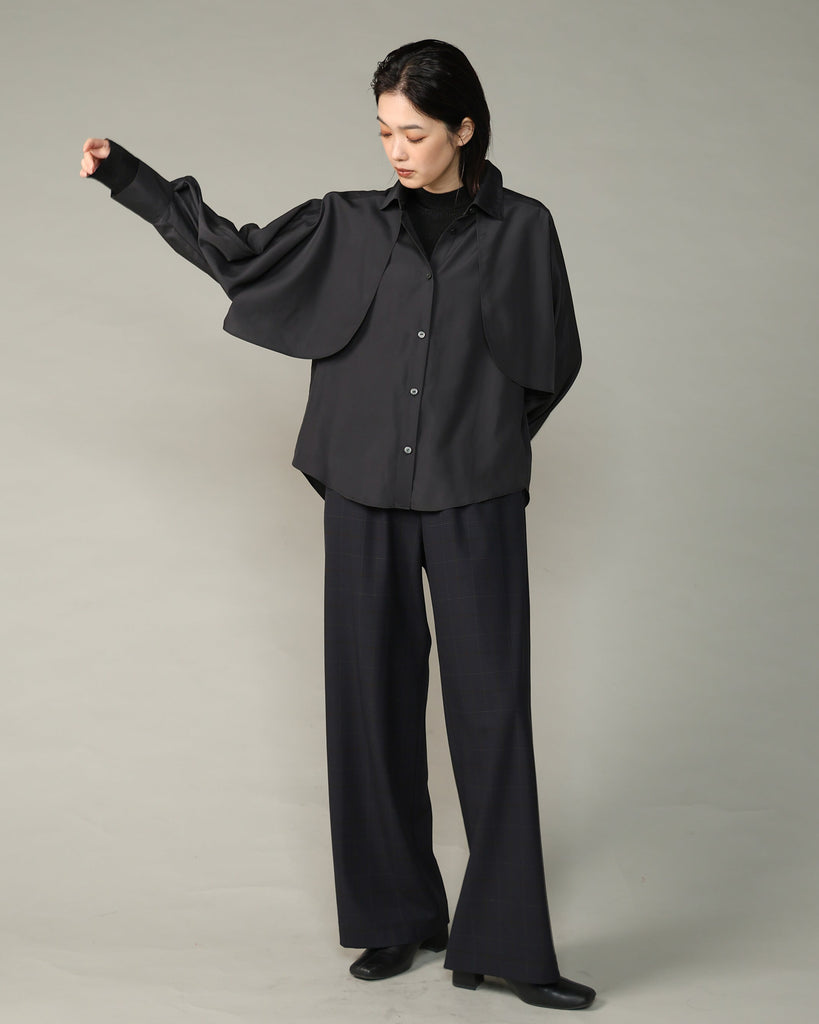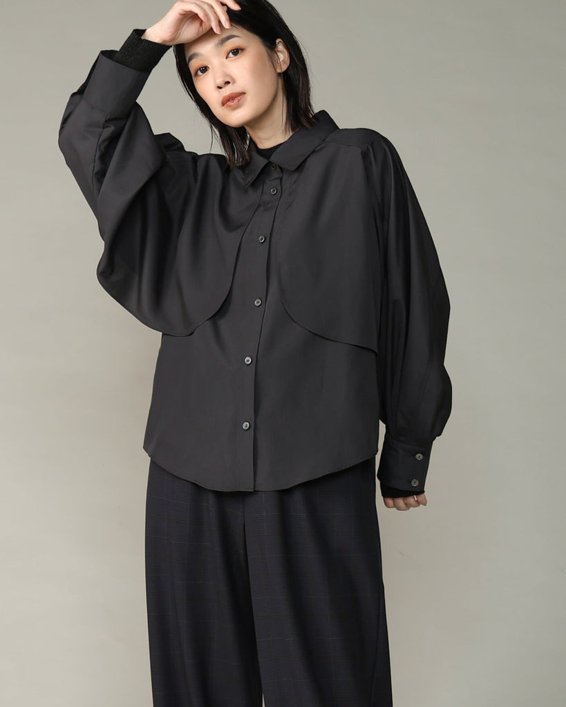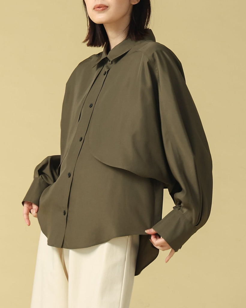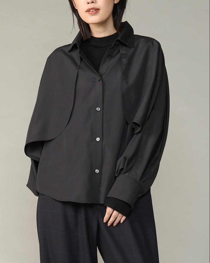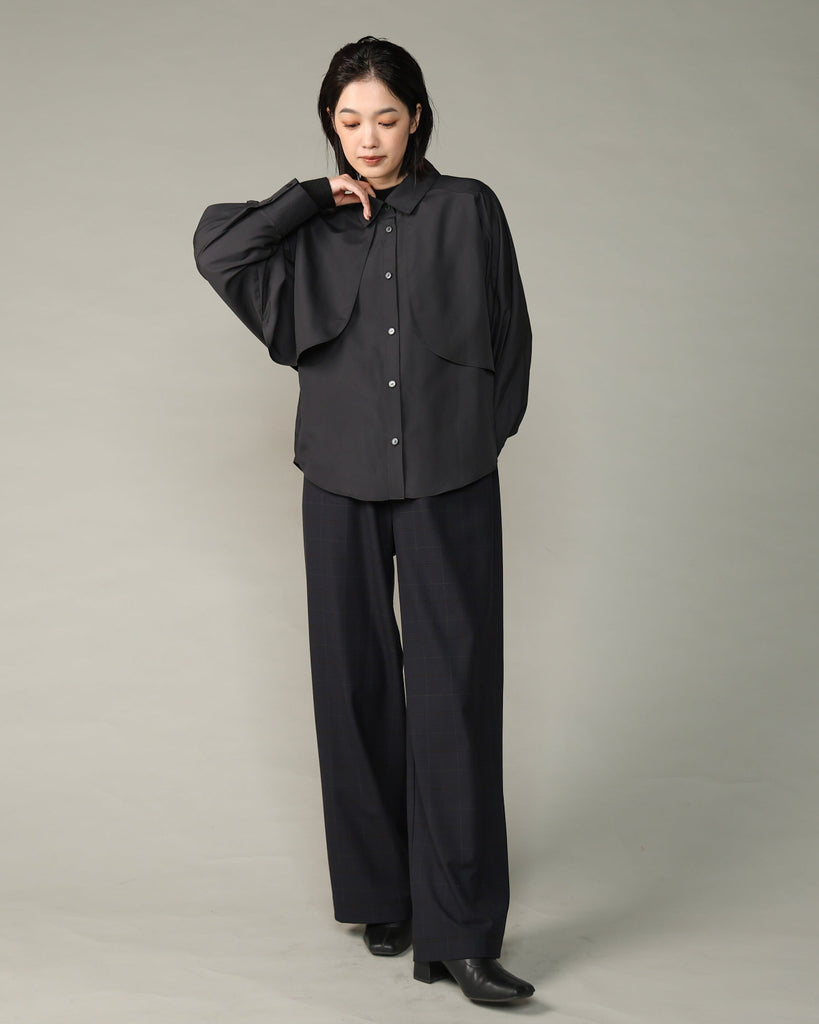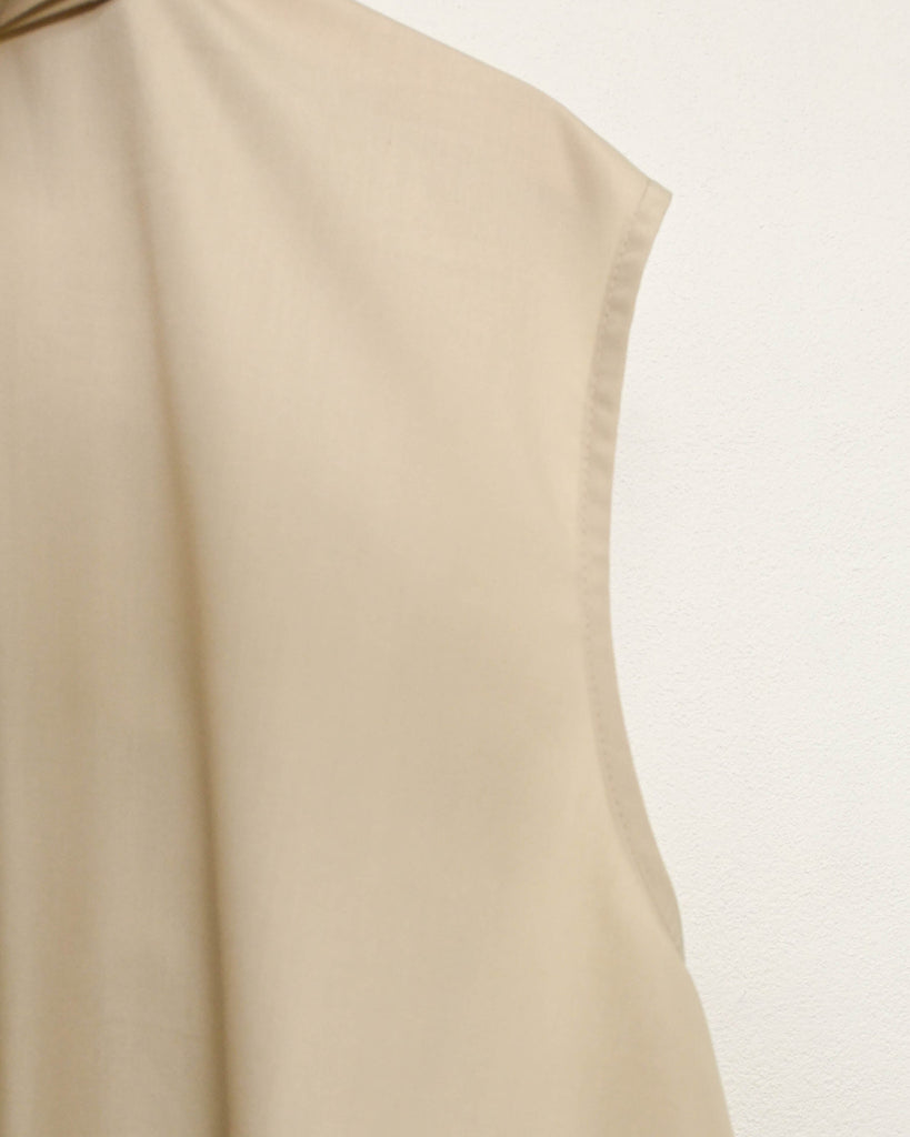 UV遮断率80%、優しい肌触りが魅力のポリエステル。イージーケア商品です。ノースリーブブラウスに大き目のフラップを重ねた様なデザインで涼しく着ていただけます。ゆったりとした身幅が抜け感を演出し、バランスの良いコーデが完成します。