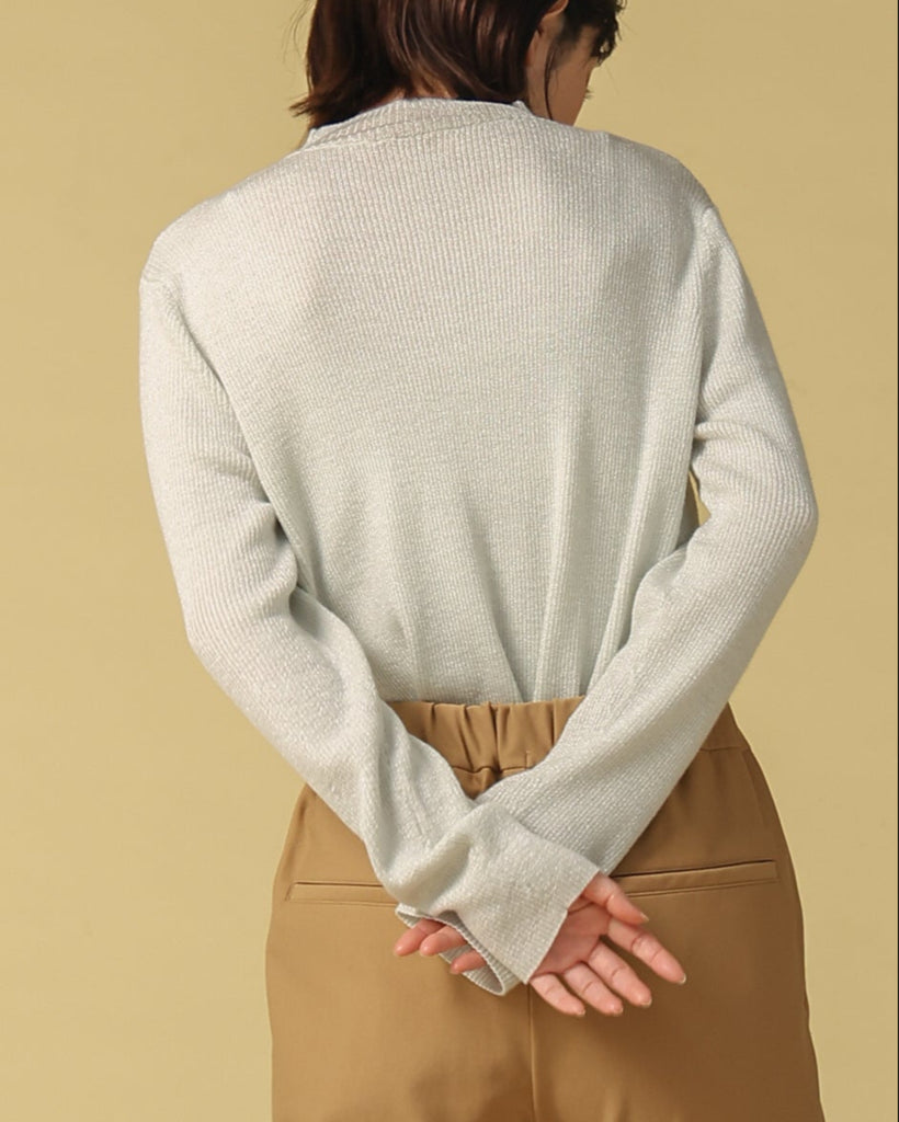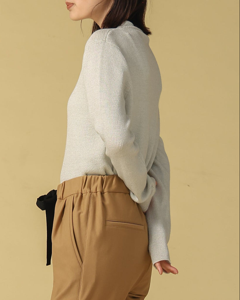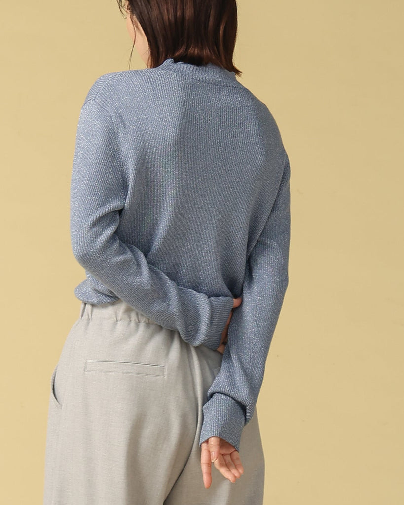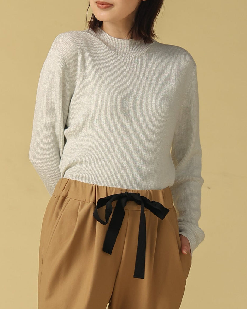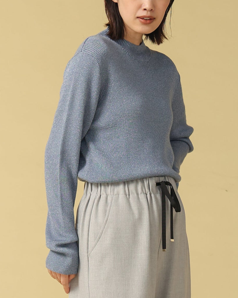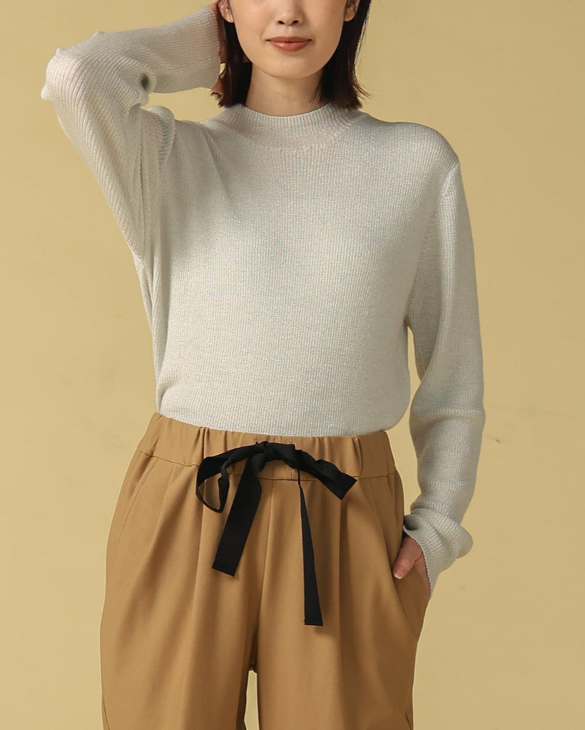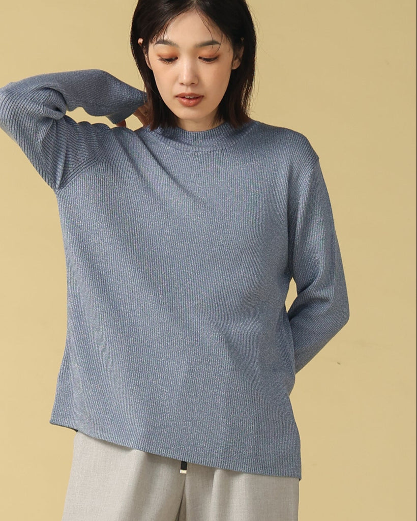 ウール混の柔らかなラメニット。ほんのり光沢のあるキレイめ上品なラメは、シンプルながら華やかさを添えてくれる一枚です。薄手なので、インナーとしてもメイントップスとしても活躍し、季節の変わり目から冬まで長いシーズン着回せます。きれいめからカジュアルまで幅広いコーデに対応できる万能アイテムです。