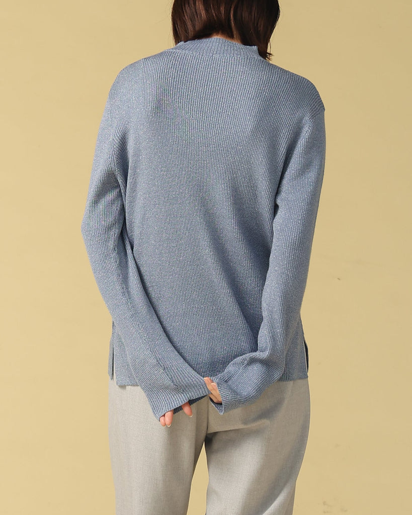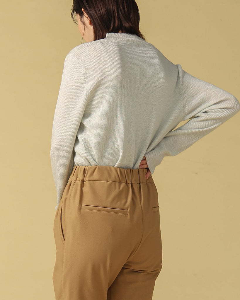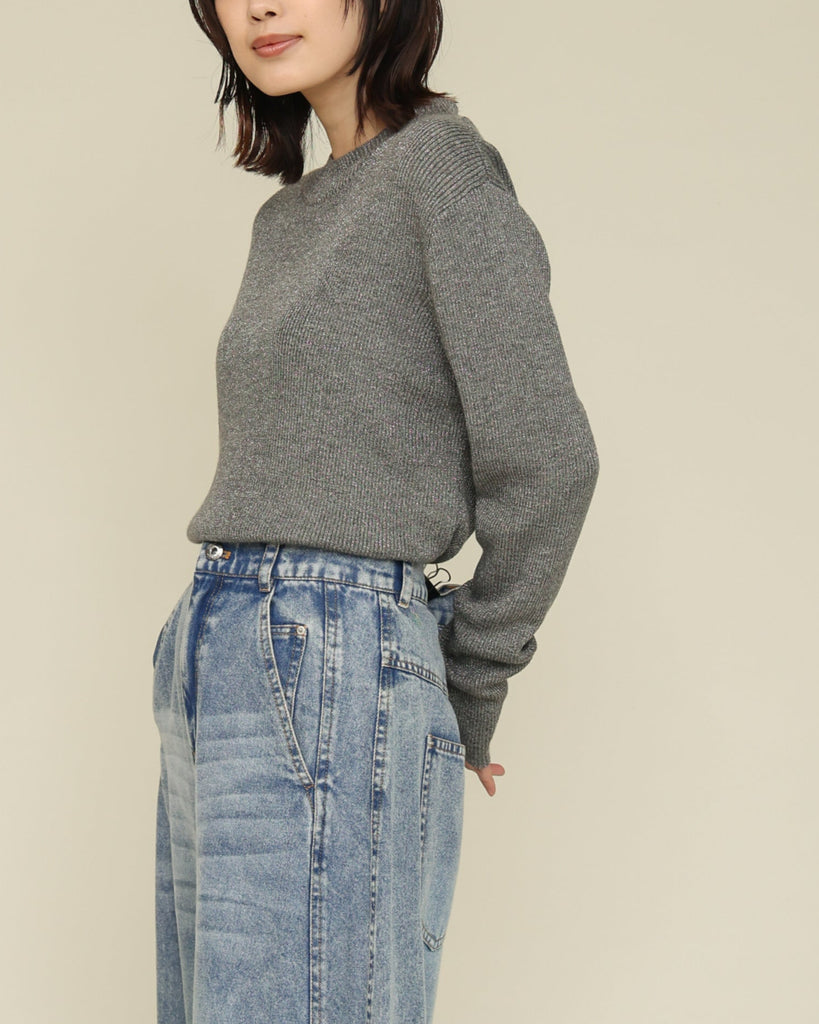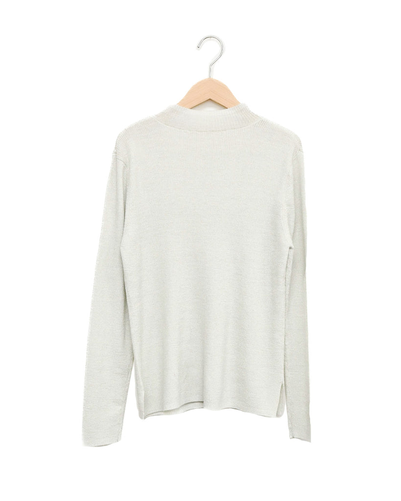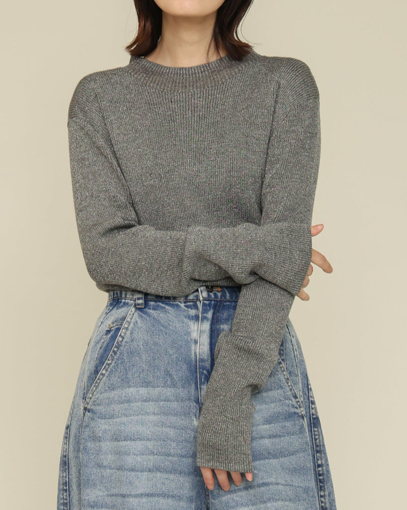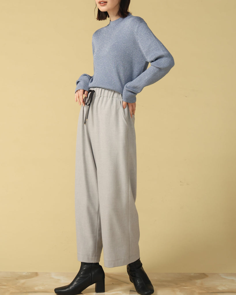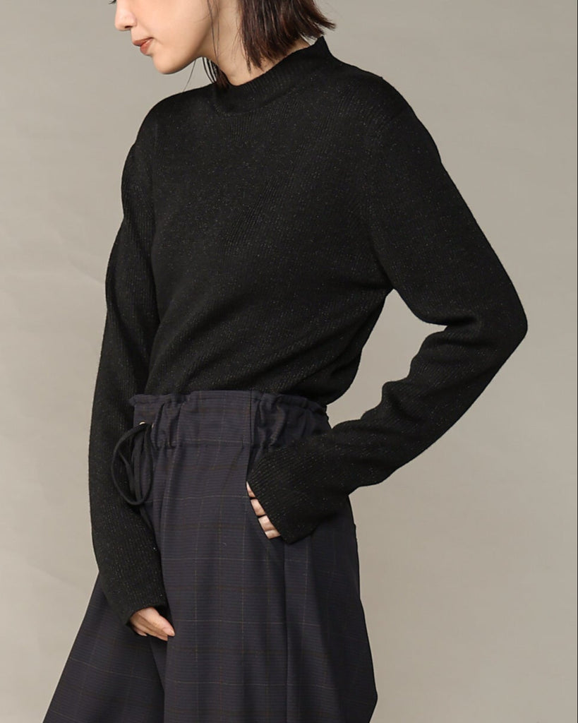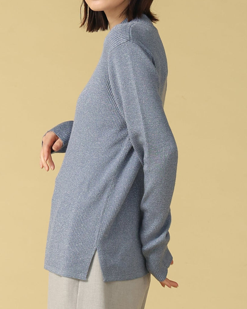ウール混の柔らかなラメニット。ほんのり光沢のあるキレイめ上品なラメは、シンプルながら華やかさを添えてくれる一枚です。薄手なので、インナーとしてもメイントップスとしても活躍し、季節の変わり目から冬まで長いシーズン着回せます。きれいめからカジュアルまで幅広いコーデに対応できる万能アイテムです。