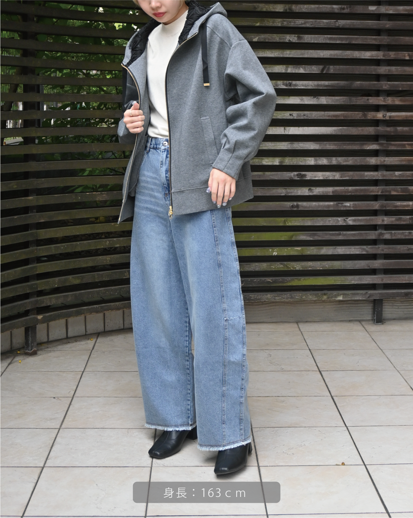 軽く肌触りの良さが特徴です。フードの内側にフラワーチュールを重ね、さりげなく女性らしさをプラス。ゆったりとしたシルエットで体のラインを拾わず、パンツにもスカートにもバランスよく合わせられる万能ブルゾン。季節の変わり目や、ちょっと羽織りたい日に重宝する一枚です。