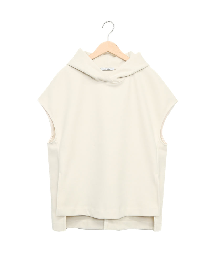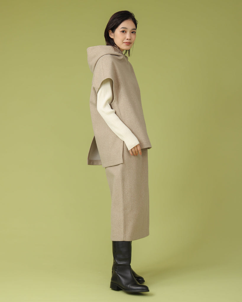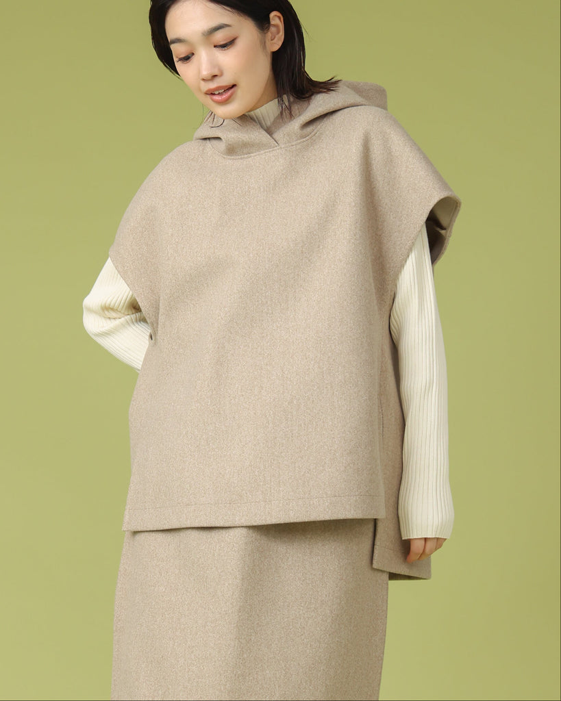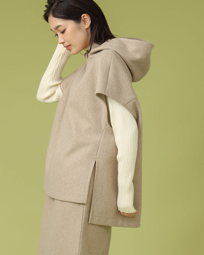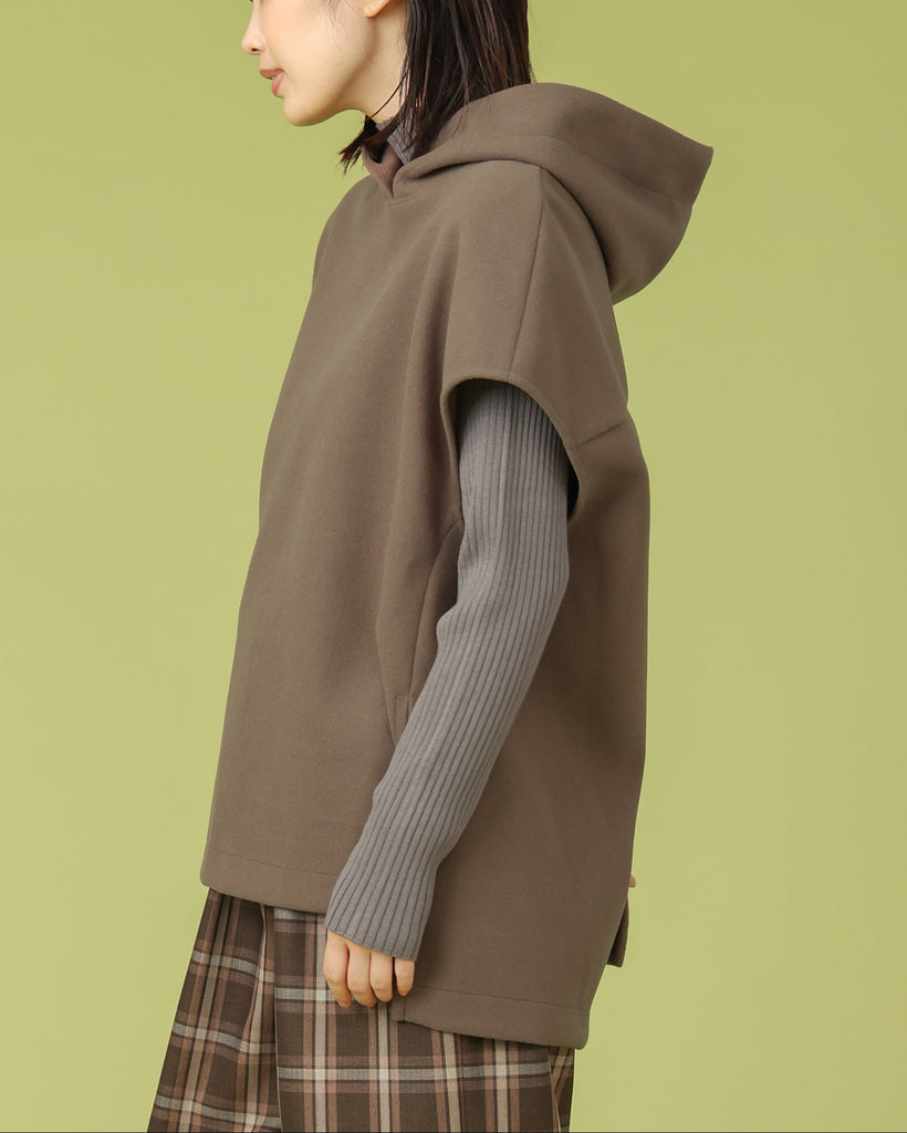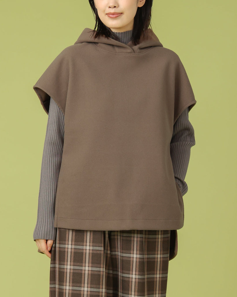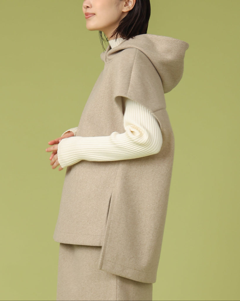 軽く柔らかい生地感で動きやすくストレスフリーな着心地です。フード付きのデザインが顔まわりに立体感をプラスし、カジュアルながらも上品な印象に。やや長めの丈感と、両サイドに入ったスリットが抜け感を生み、重ね着してももたつかない設計になっています。同素材シリーズのパンツやスカートとセットアップで着用すれば、統一感のある洗練されたスタイルに。