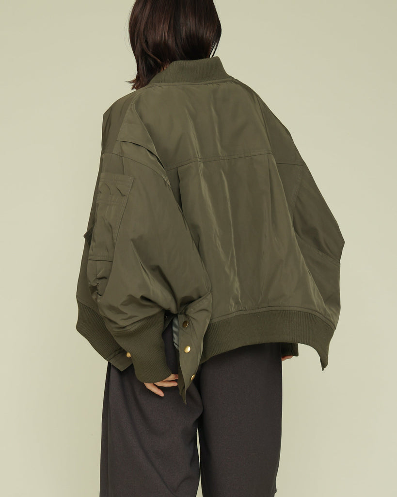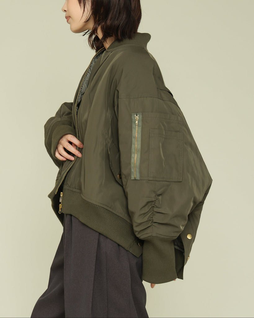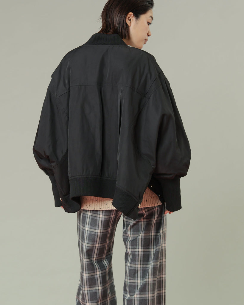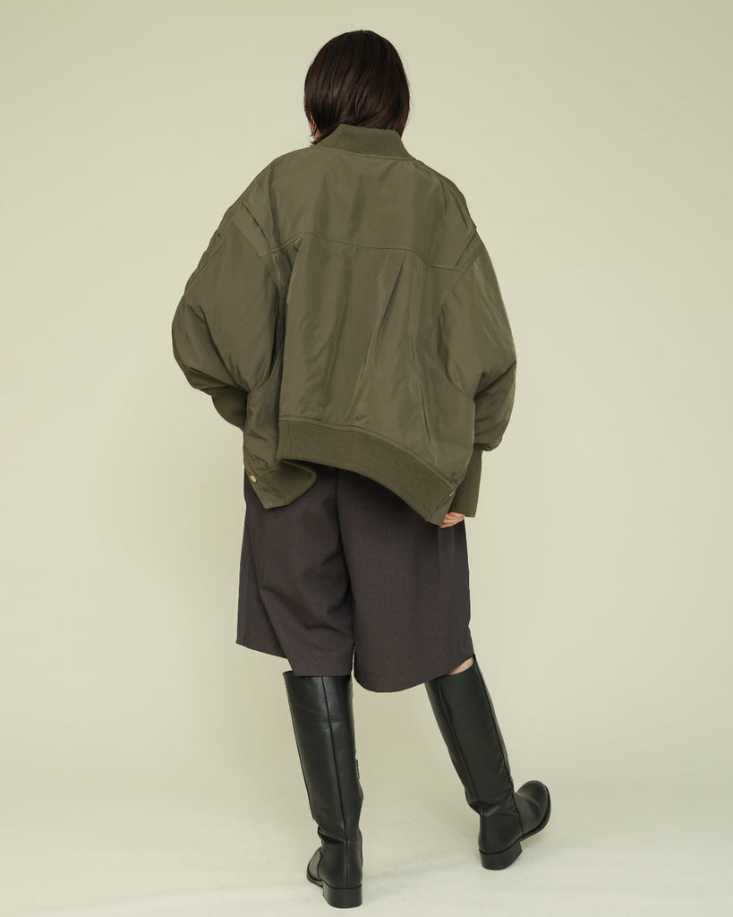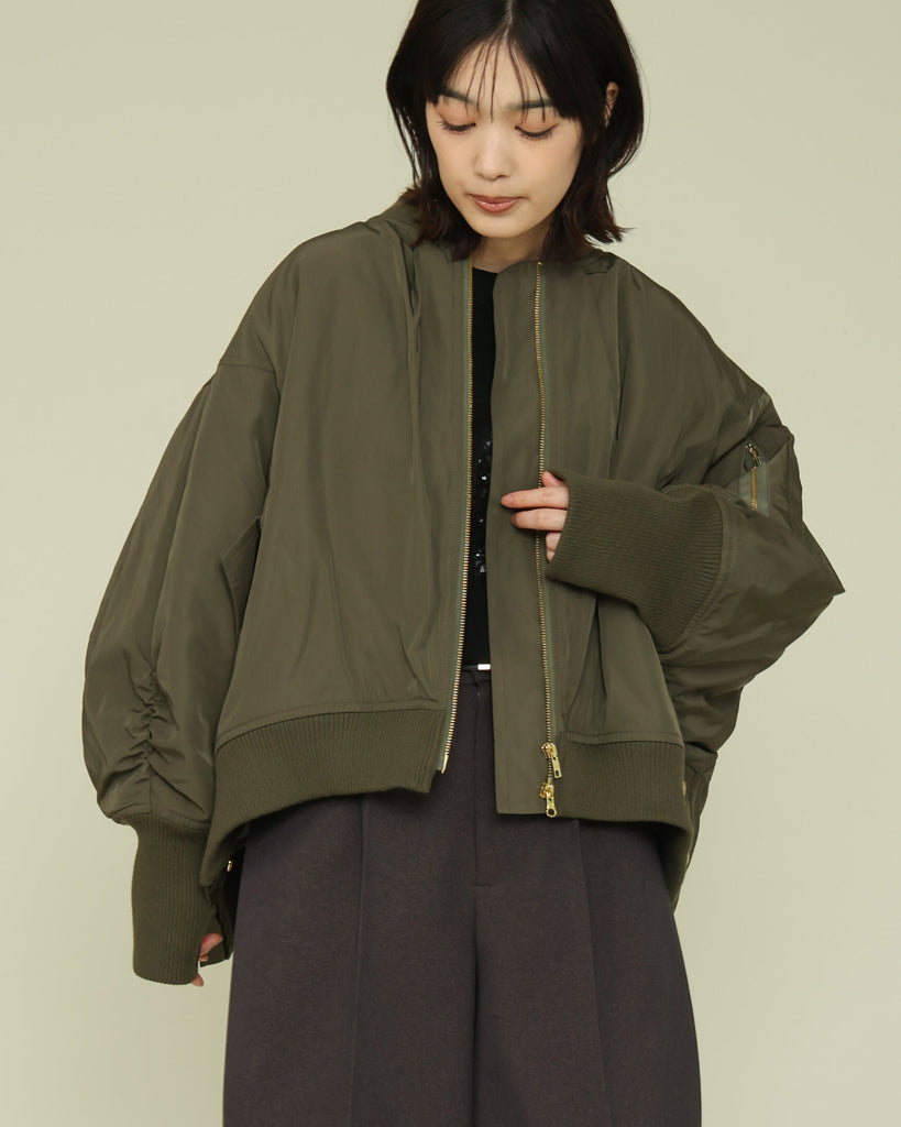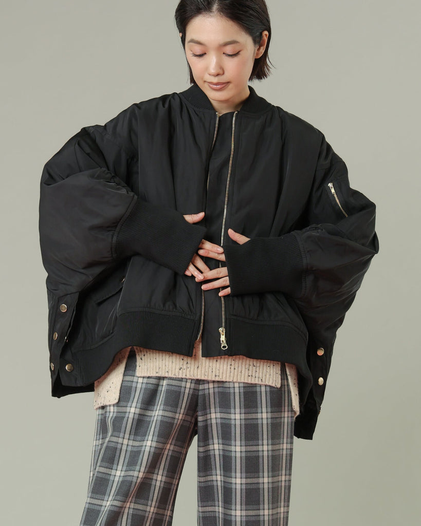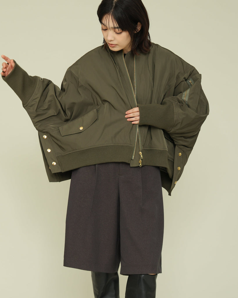 ポンチョとMA-1を合体させた様な裏キルティングのショートブルゾン。