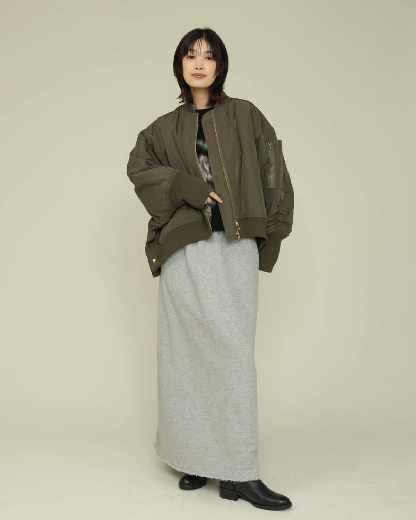 肩のラインを落としたドロップショルダーと、たっぷりとした袖のボリュームがこなれ感を演出。羽織るだけで抜け感のあるスタイリングが完成します。裾のドローストリングでシルエットの調整もでき、スカートにもパンツにも合わせやすい丈感。カジュアルコーデに活躍する、今季の主役アウターです。