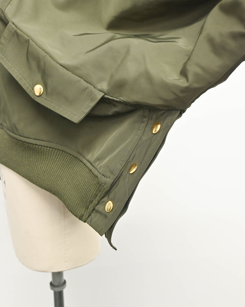 ハリと光沢のあるナイロンツイルを使用し、裏地は中綿入りのキルティング仕様。