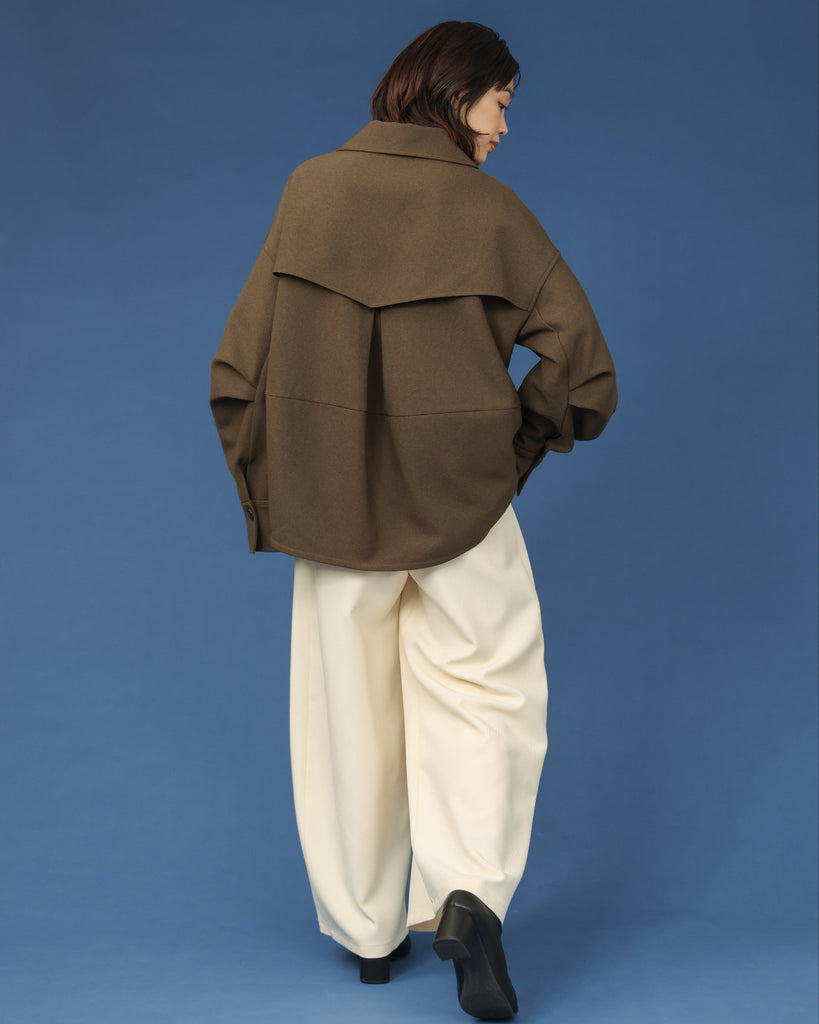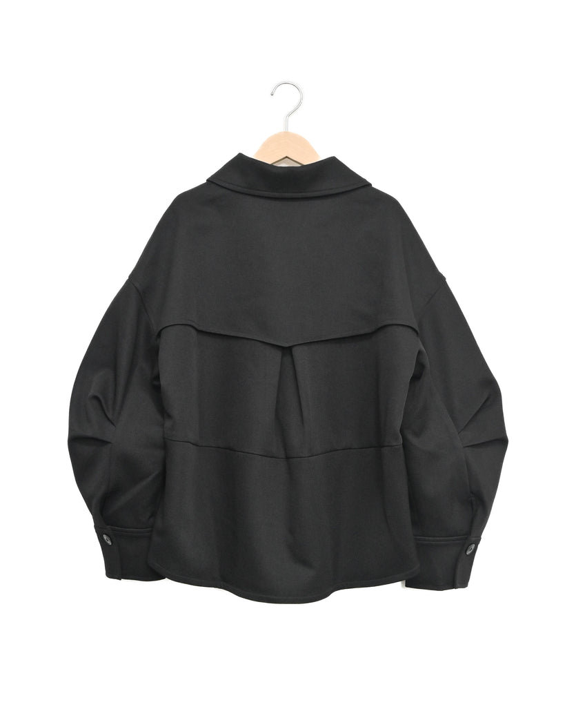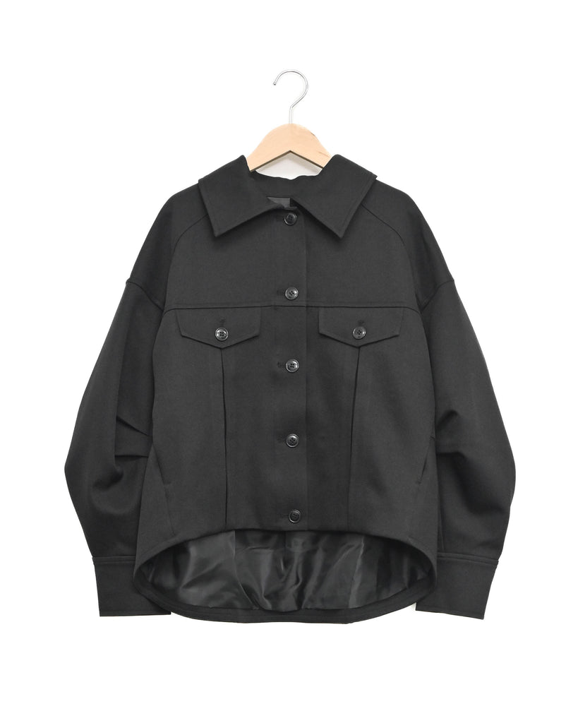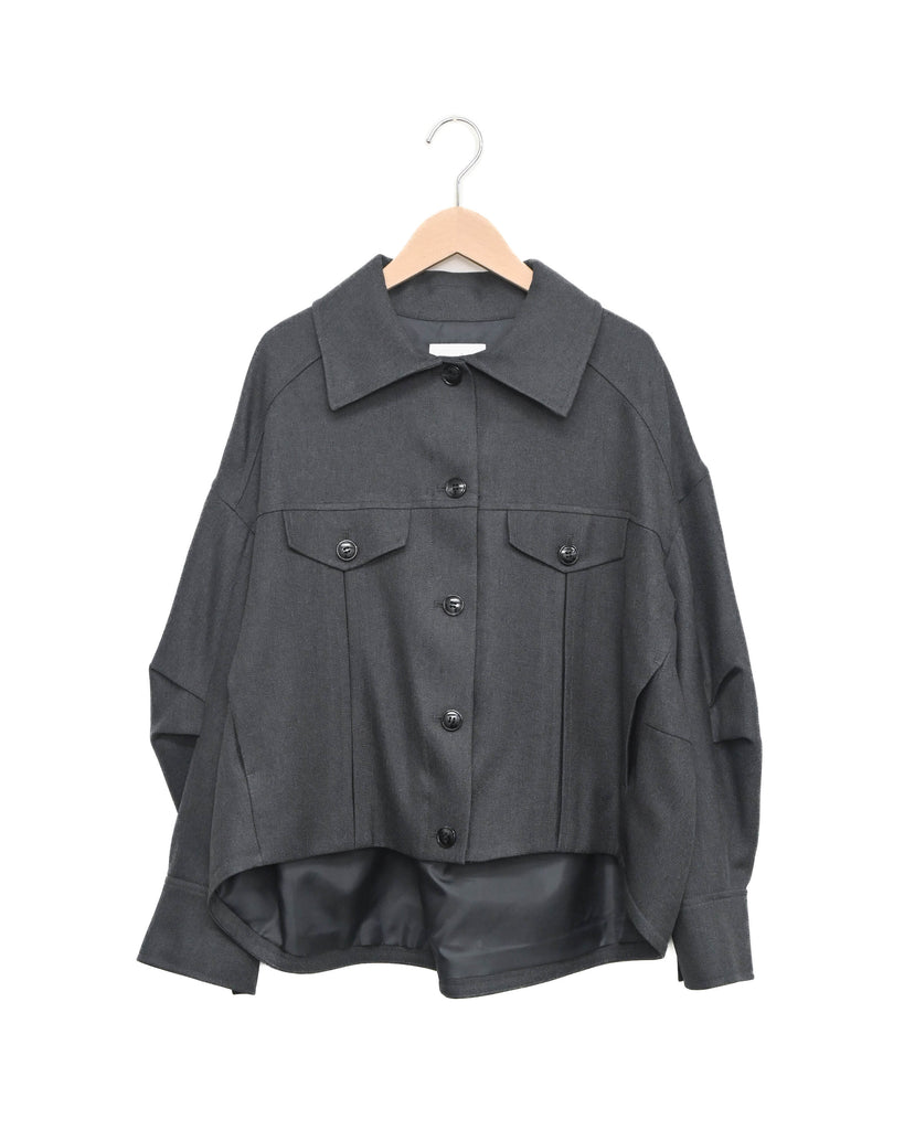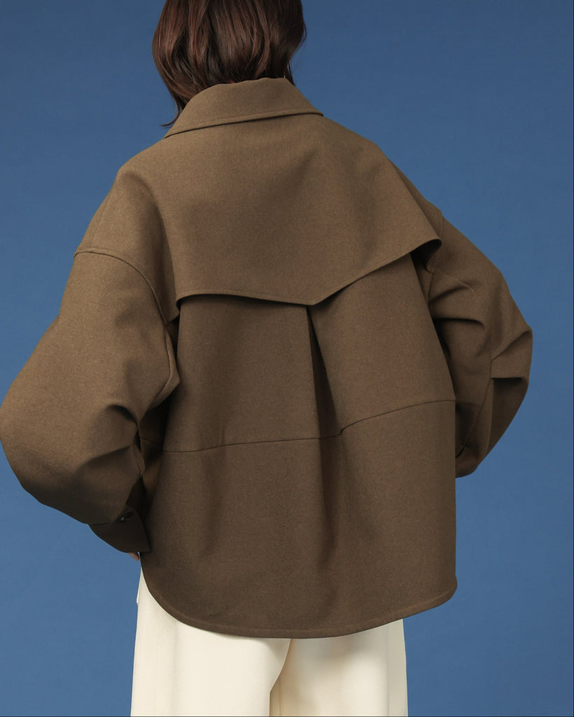 後ろ下がりの裾や立体的な袖のフォルムが、着るだけでこなれ感を演出します。背中に大きめのフラップデザインを施すことで、シンプルな中にも存在感をプラス。程よいショート丈なのでパンツやスカート、ワンピースともバランスよく合わせられ、季節の変わり目に活躍する一着です。