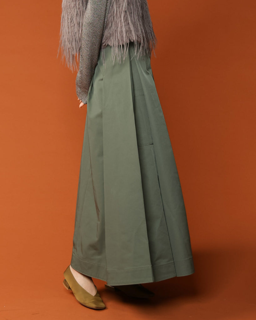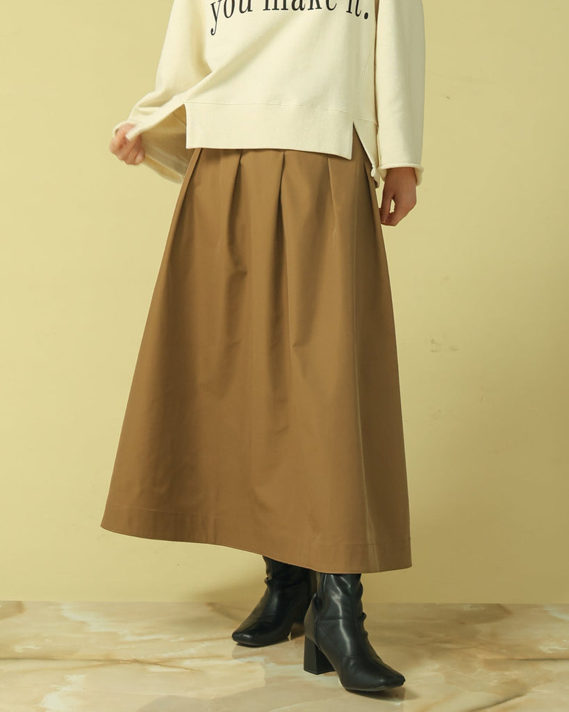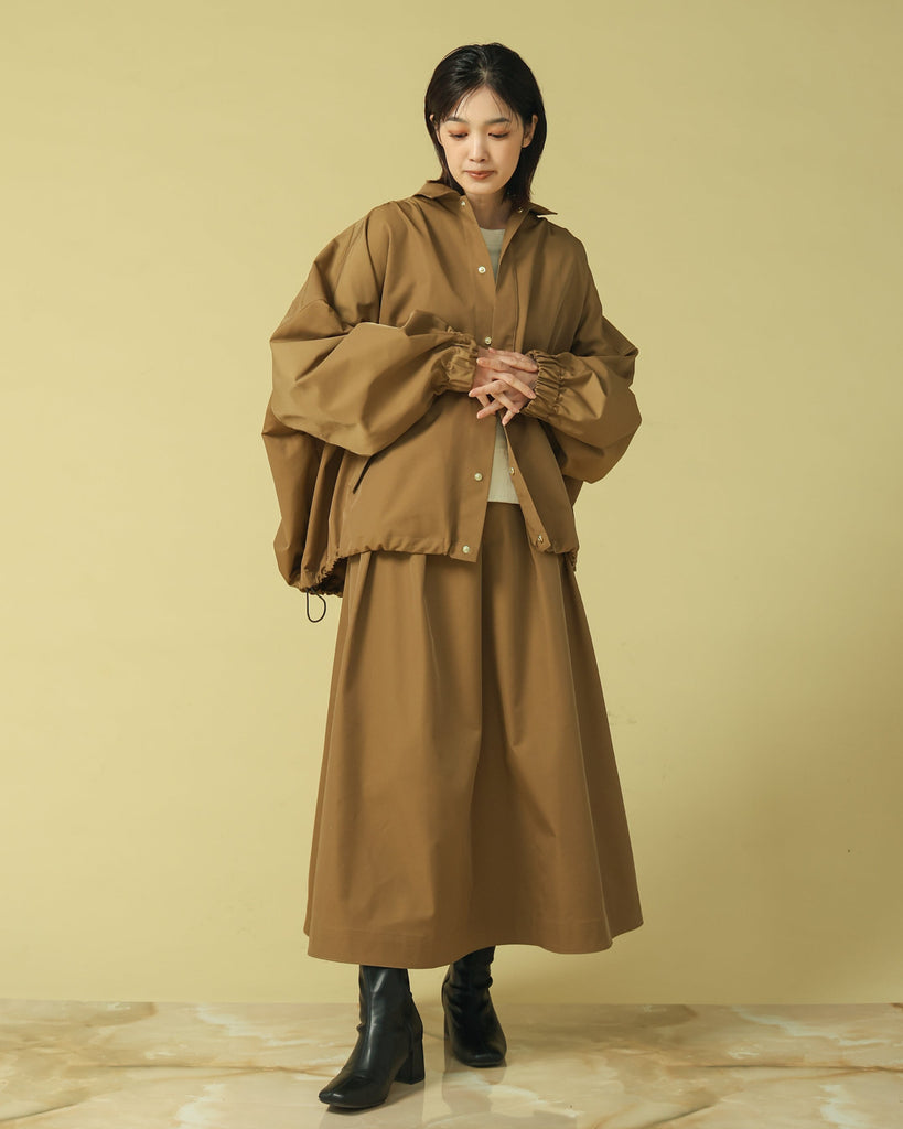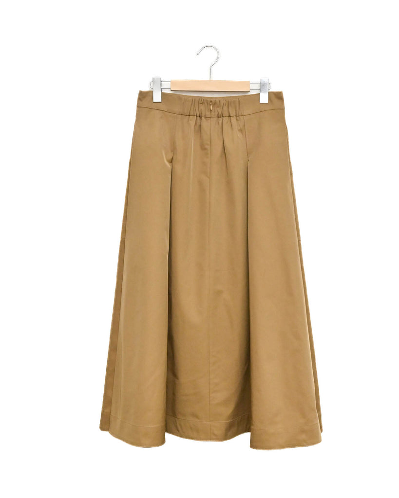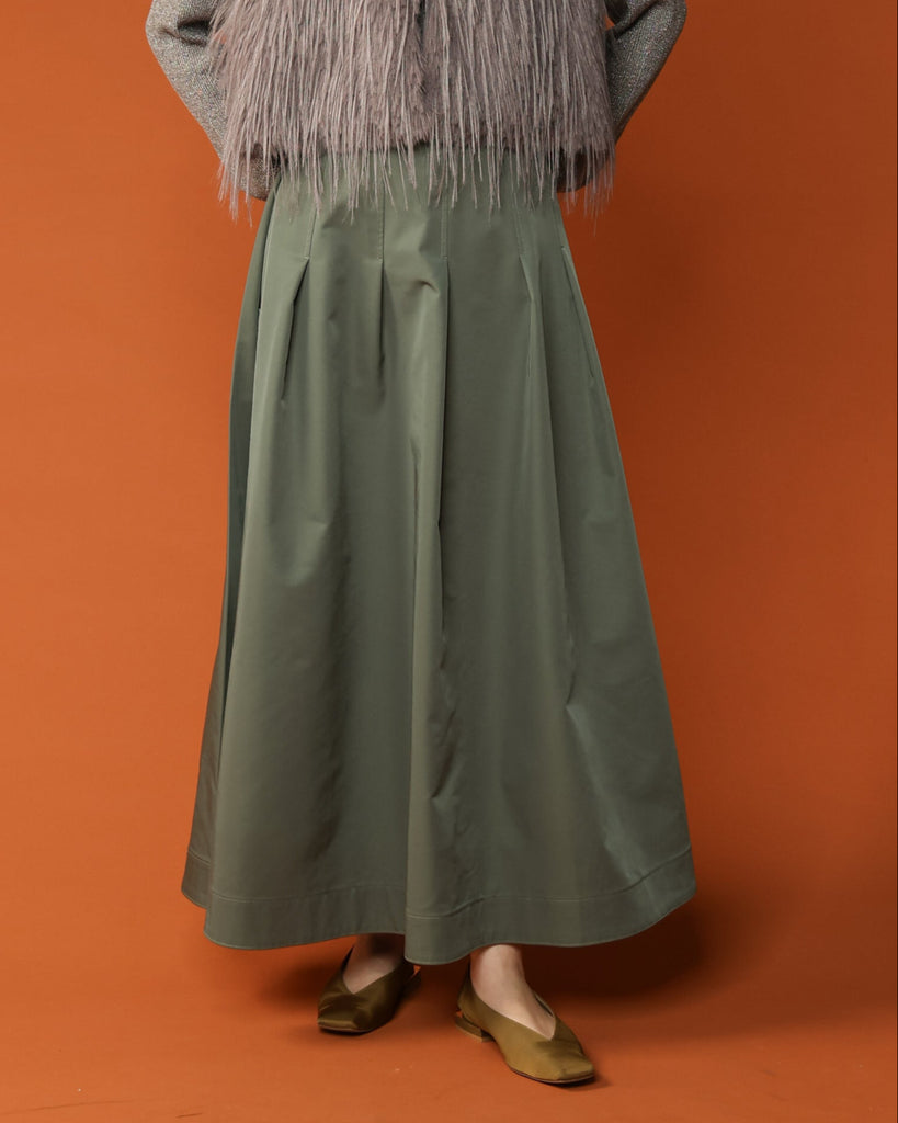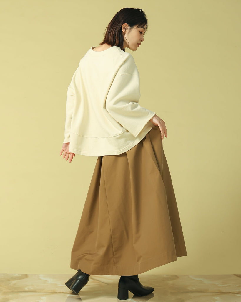 ほどよいハリ感が立体的なシルエットを作り出し、動くたびにふんわりと広がります。後ろゴムの仕様で膨れすぎない程よいボリュームが特徴の1枚です。生地感とシルエットの絶妙なバランスで、カジュアルからきれいめまで幅広く対応し、シーズンレスで活躍する一枚です。
