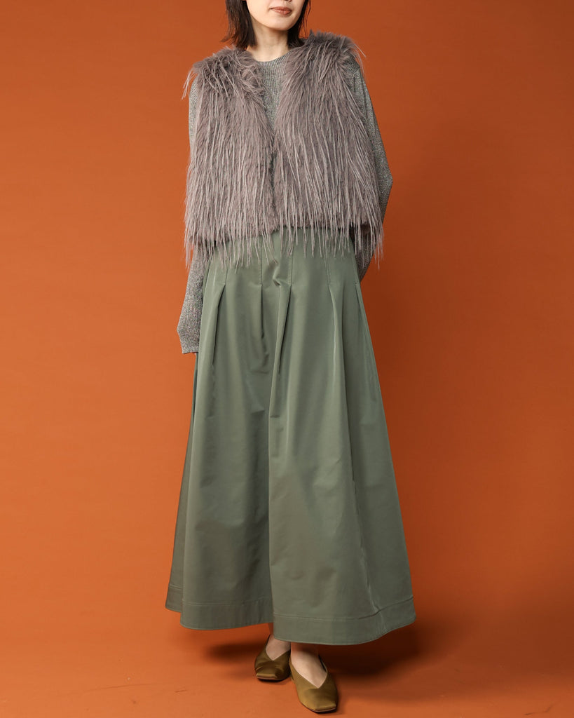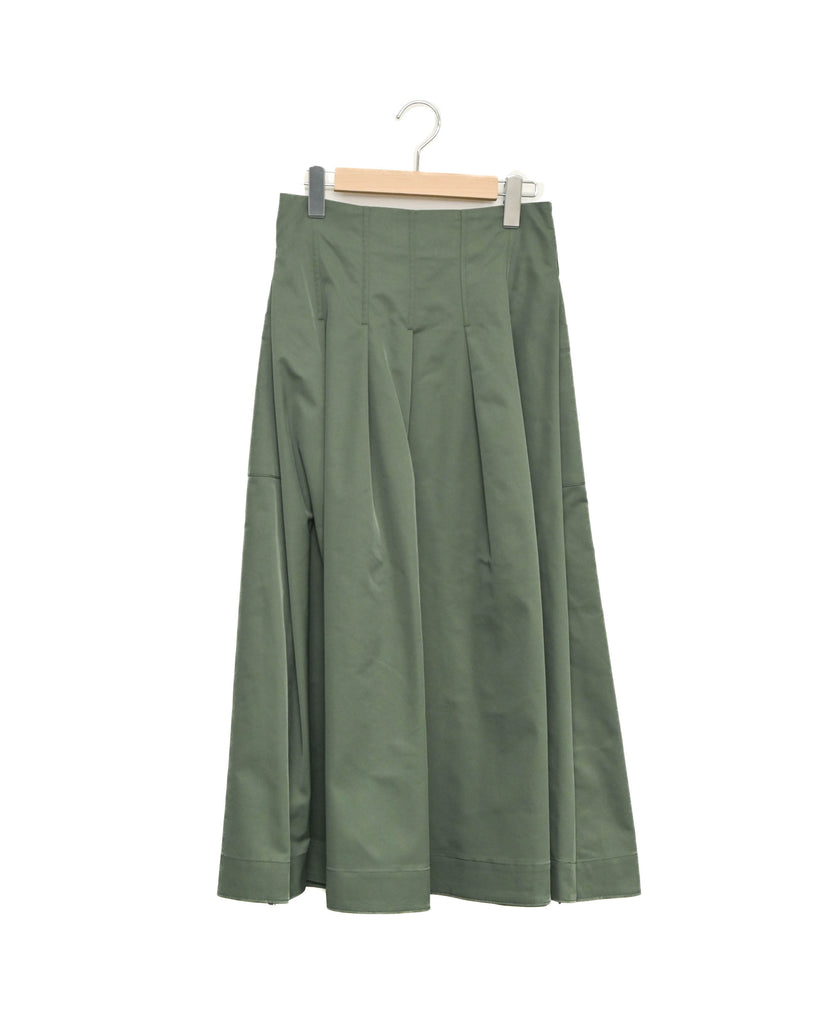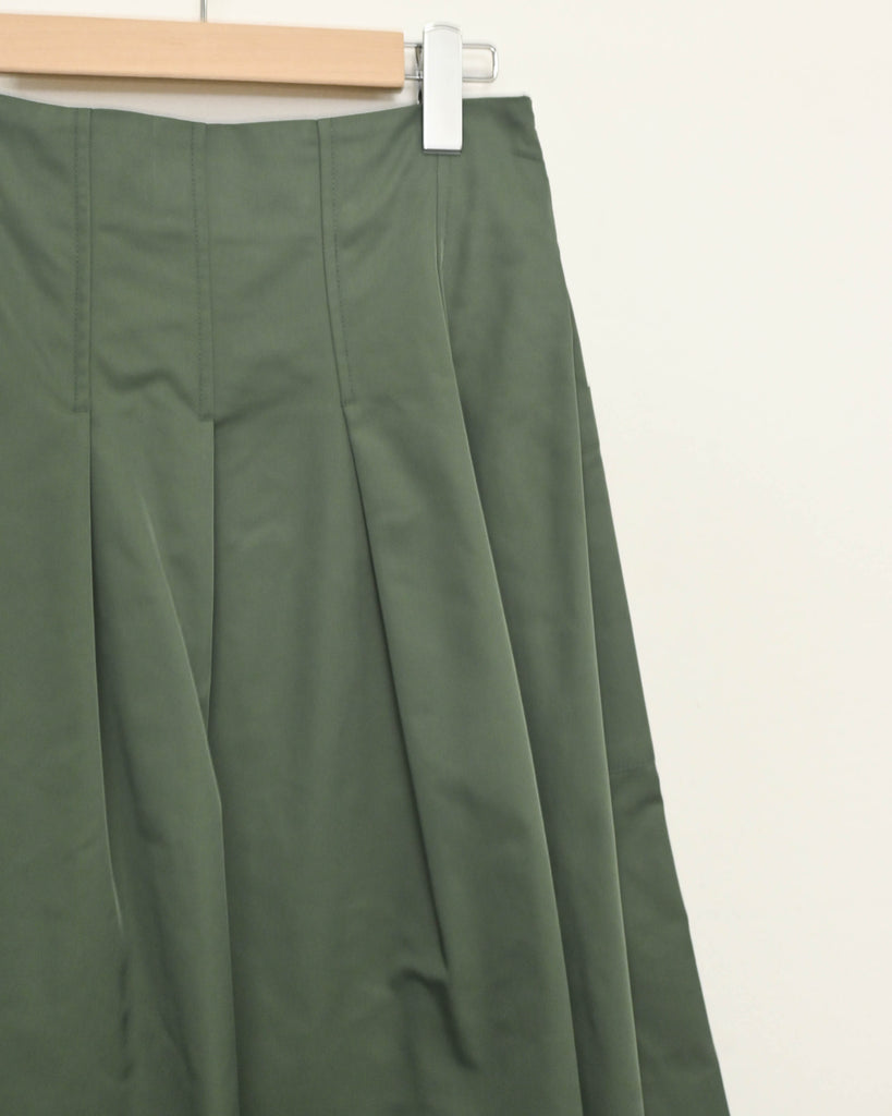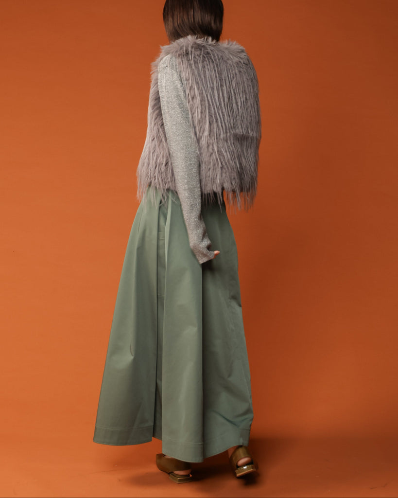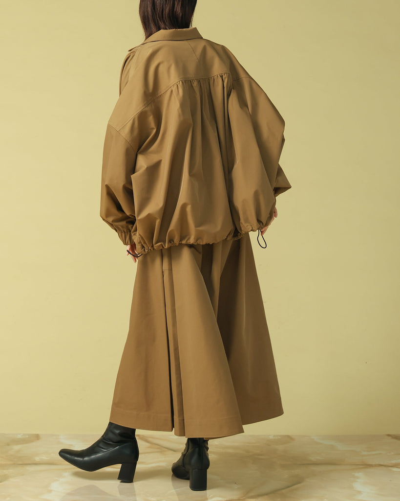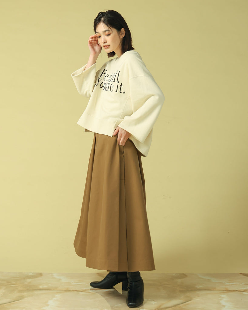 ほどよいハリ感が立体的なシルエットを作り出し、動くたびにふんわりと広がります。後ろゴムの仕様で膨れすぎない程よいボリュームが特徴の1枚です。生地感とシルエットの絶妙なバランスで、カジュアルからきれいめまで幅広く対応し、シーズンレスで活躍する一枚です。