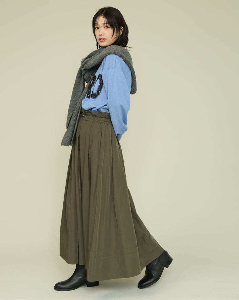 ウエストはゴム仕様のリラックス感のある穿き心地で、フロントのドロストでサイズ調整が可能。ギャザーとタックが生み出す、裾にかけてふんわりとしたシルエットが女性らしく、動くたびに優雅に揺れます。ニットやスウェットと合わせてカジュアルに、ブラウスやジャケットと合わせてきれいめにも着こなせる万能アイテムです。