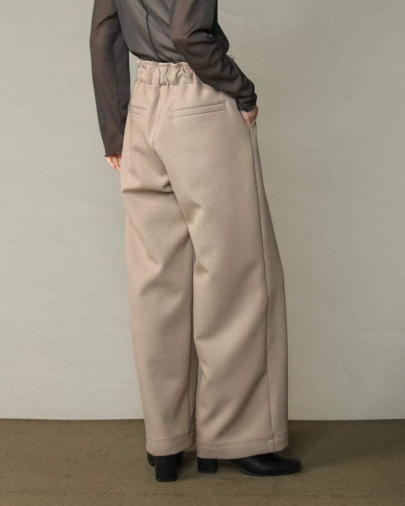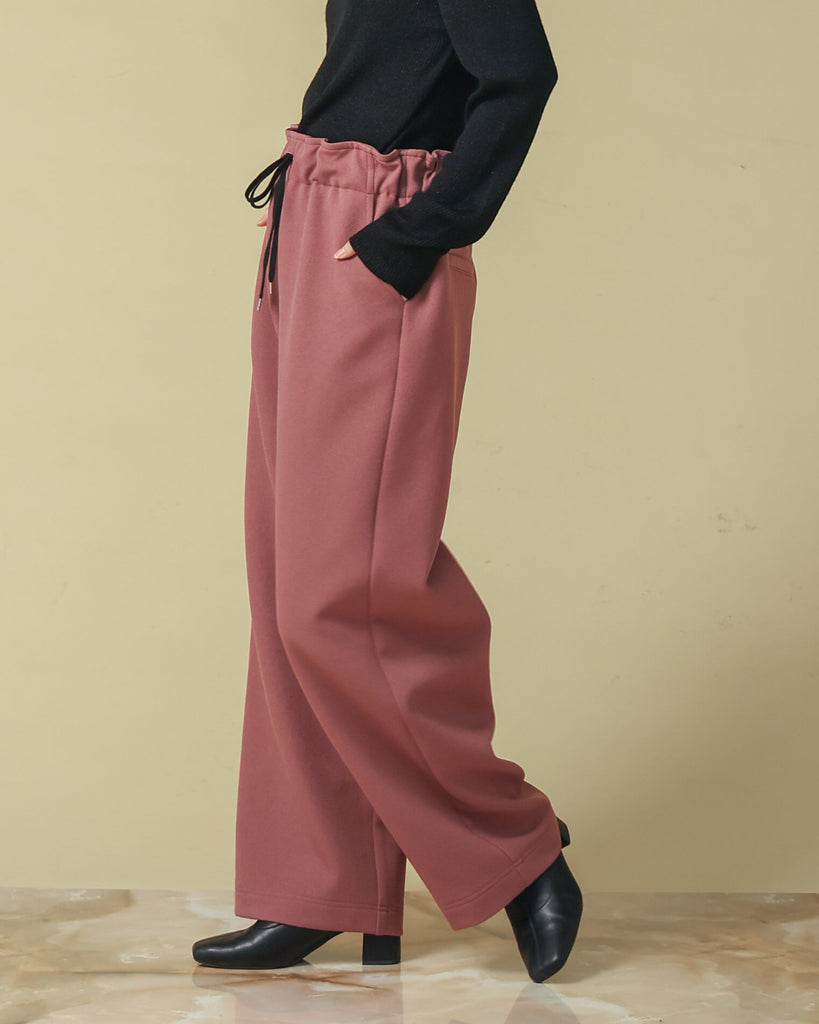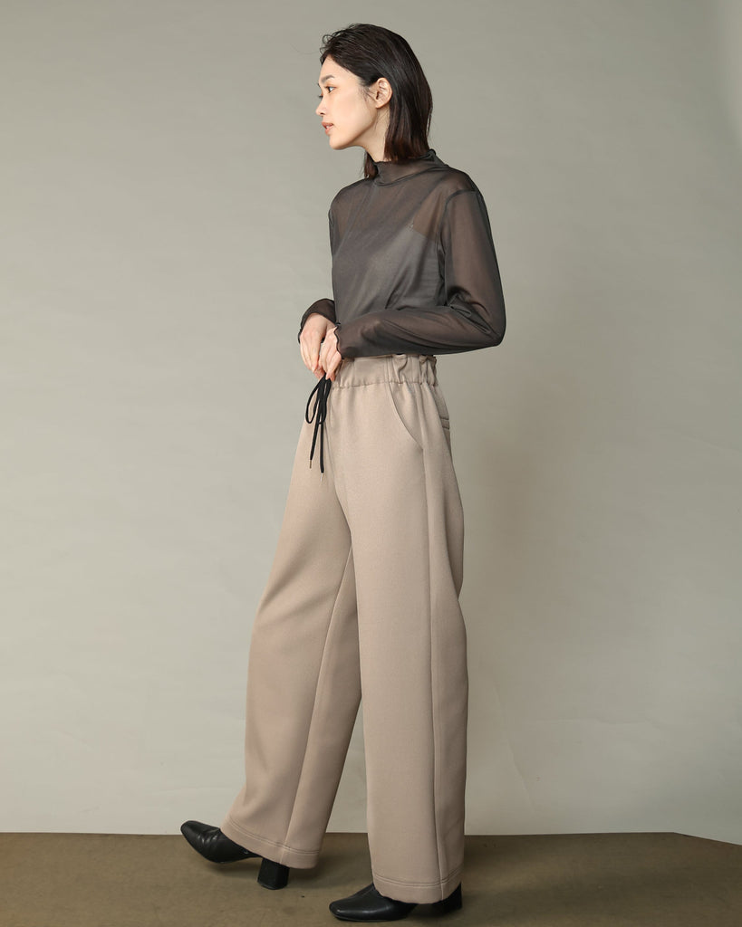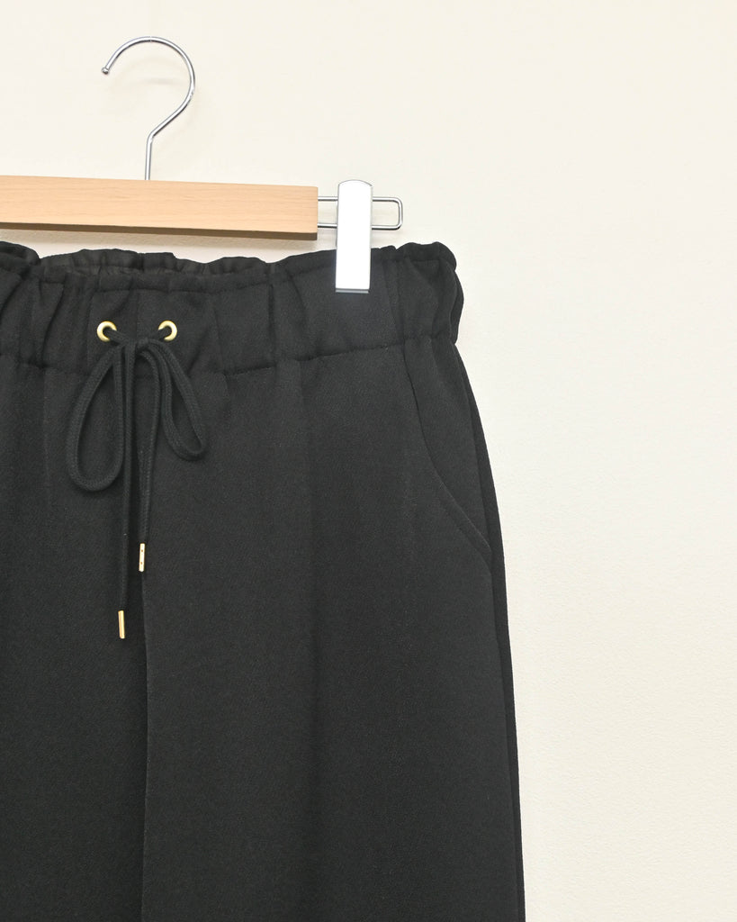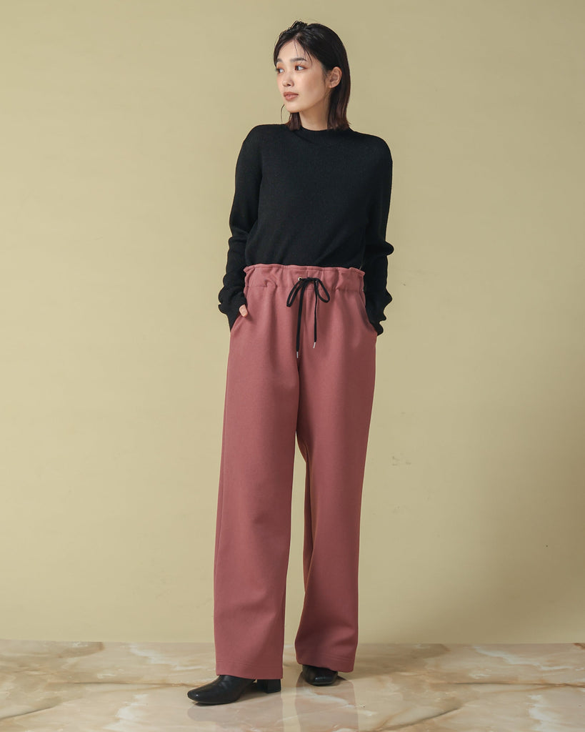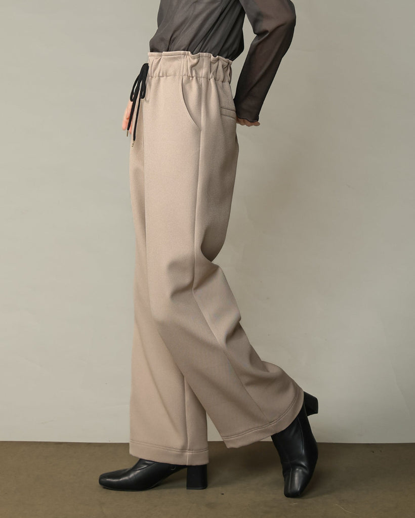 腰まわりはすっきり見せつつ、太ももから裾にかけて自然に広がるセミワイドシルエットで脚のラインを拾いにくく、女性らしいシルエットを演出します。